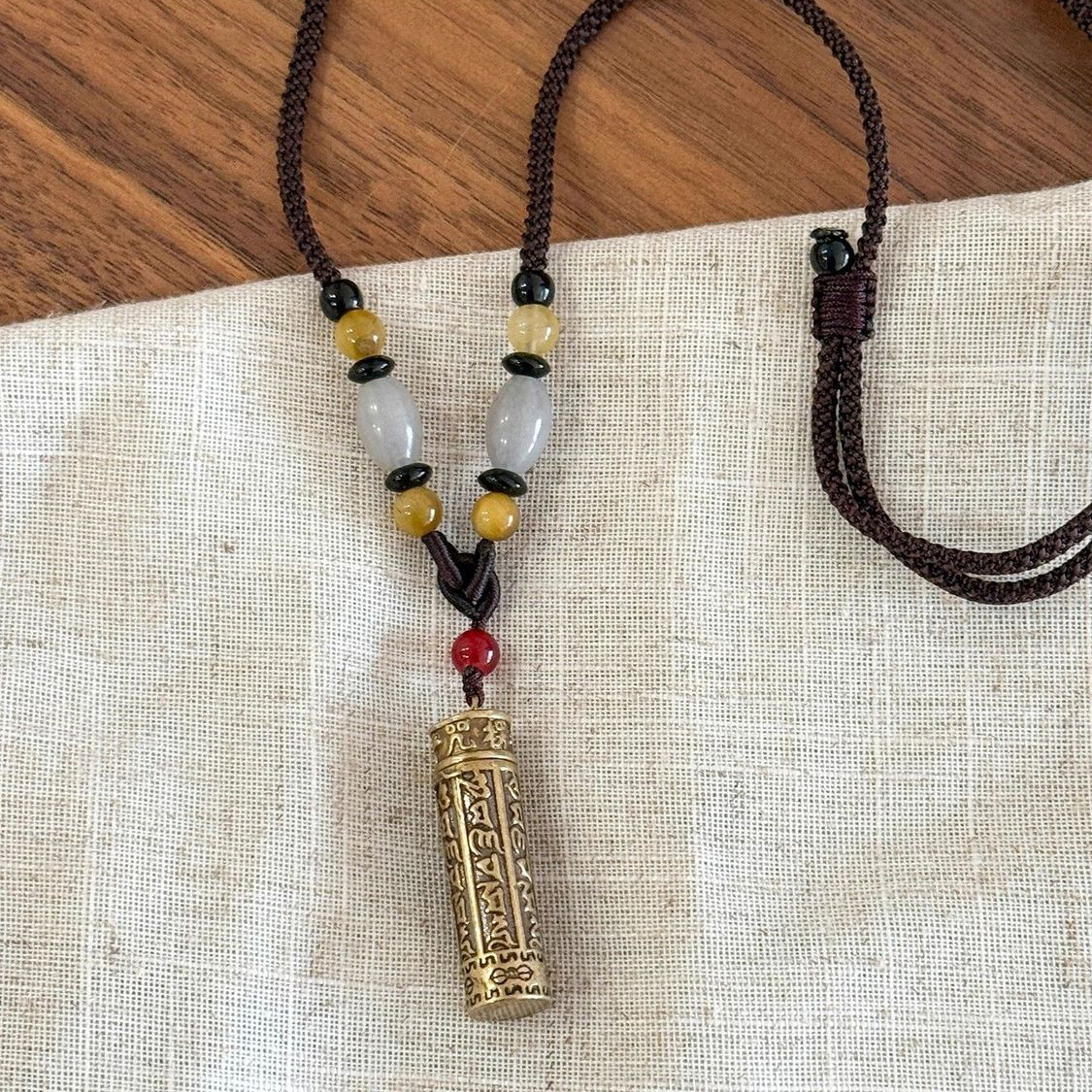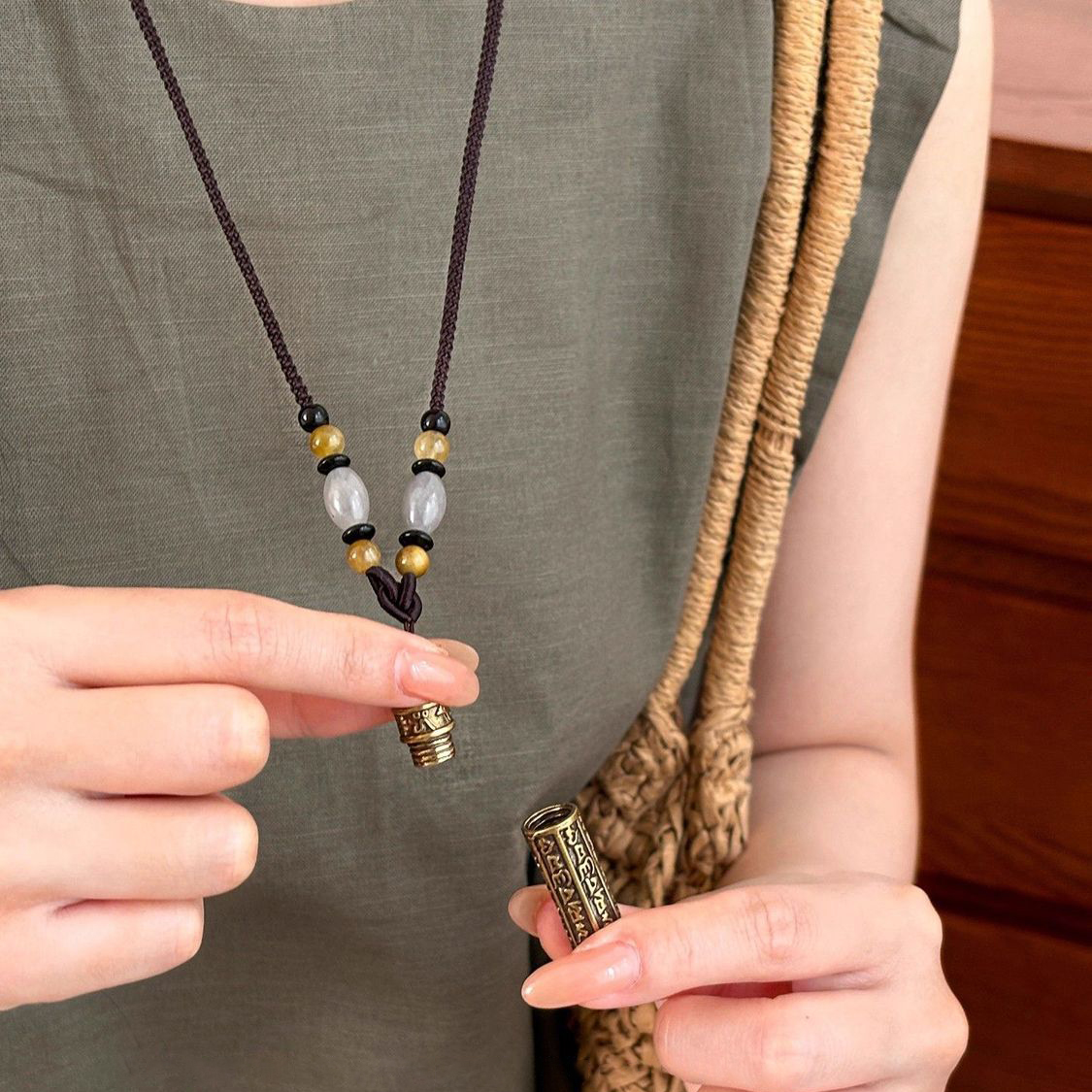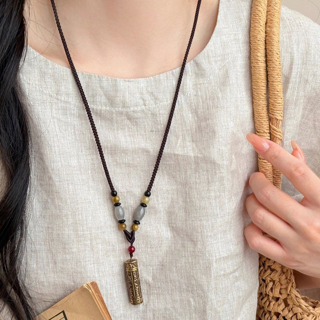 新中式可打开圆柱盒黄铜吊坠项链女2025新款民族风挂绳毛衣链配饰