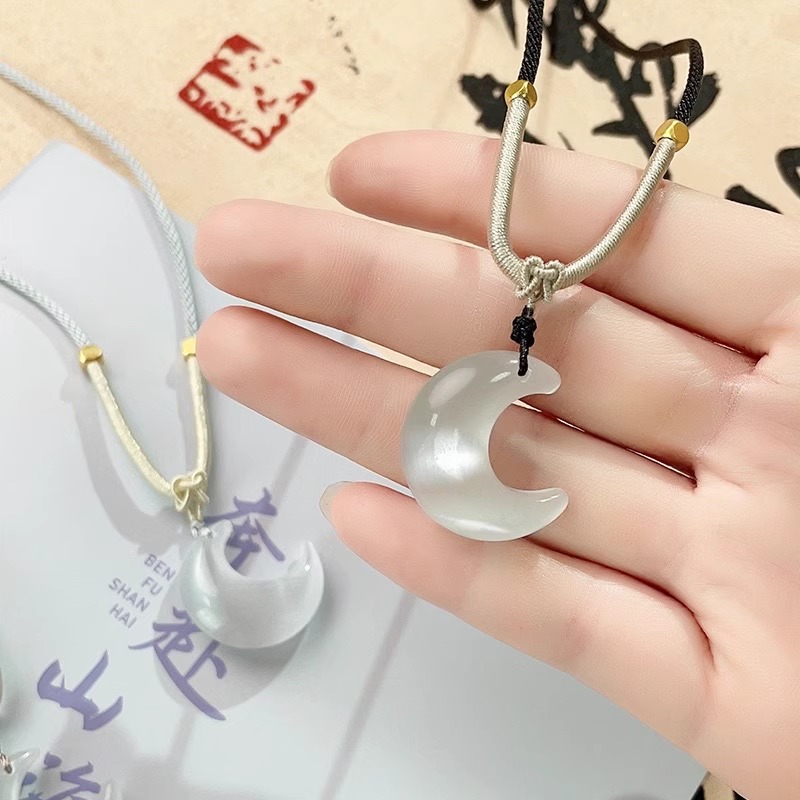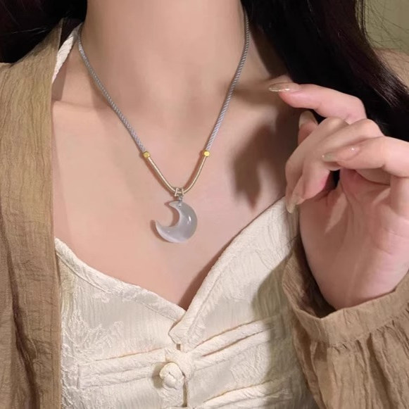 和田玉月亮项链2025新款爆款轻奢小众碧玉编织绳子转运珠吊坠女士