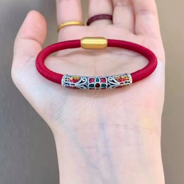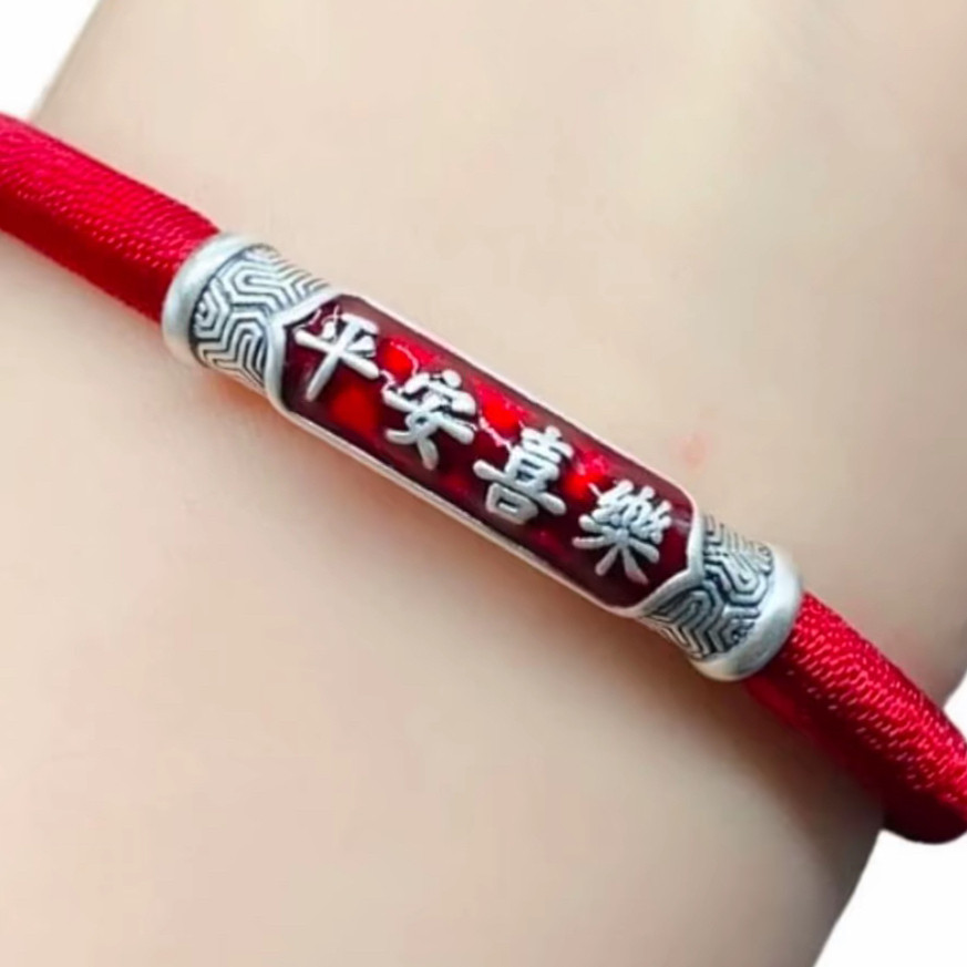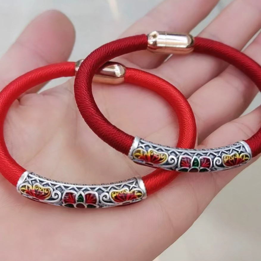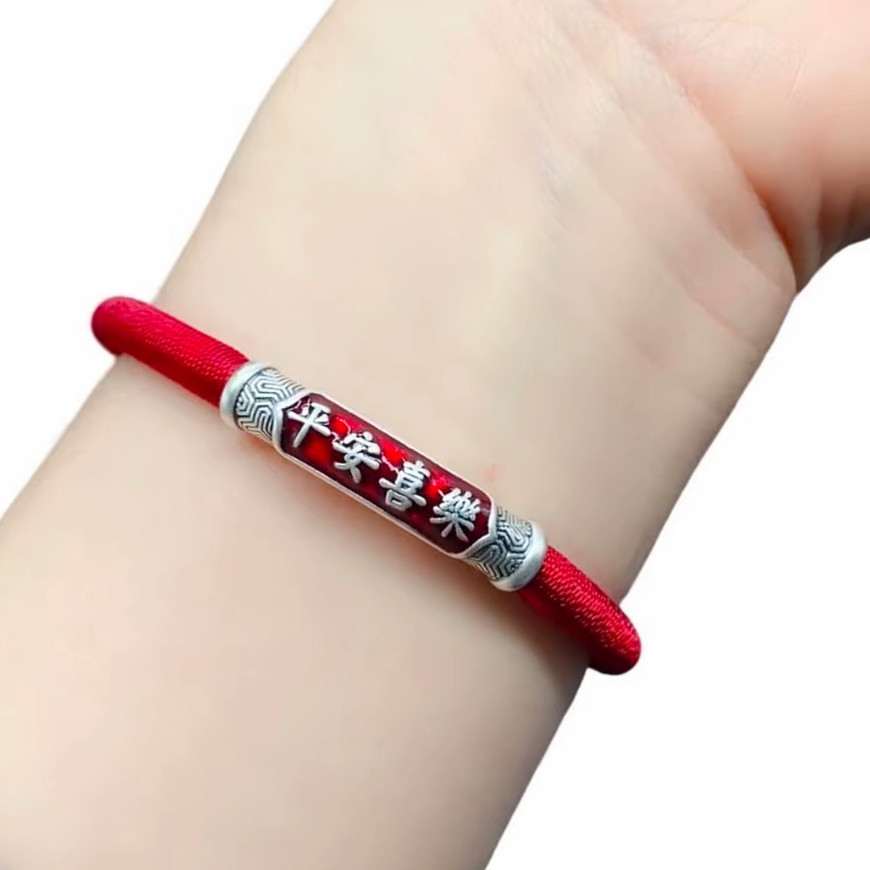 新款足银999弯管朱砂手链珐琅彩平安喜乐弯管手链女款本命年红绳