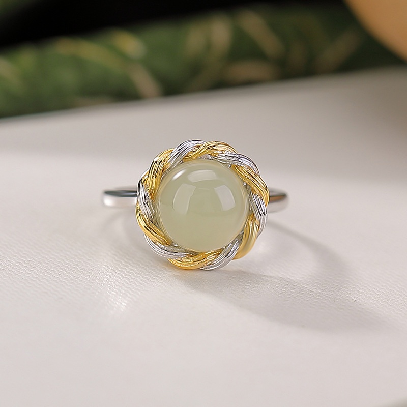 S925纯银天然和田玉晴水玉扭麻圆形几何百搭银戒指开口指环时尚女