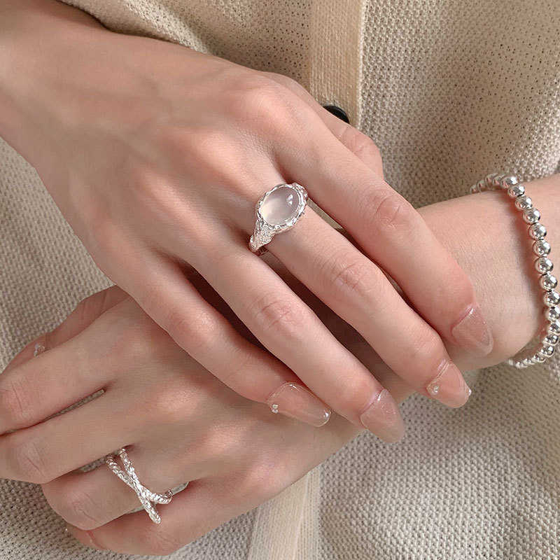 S925纯银肌理感熔白玛瑙戒指不规则锡纸开口戒蛋形玉石指环女