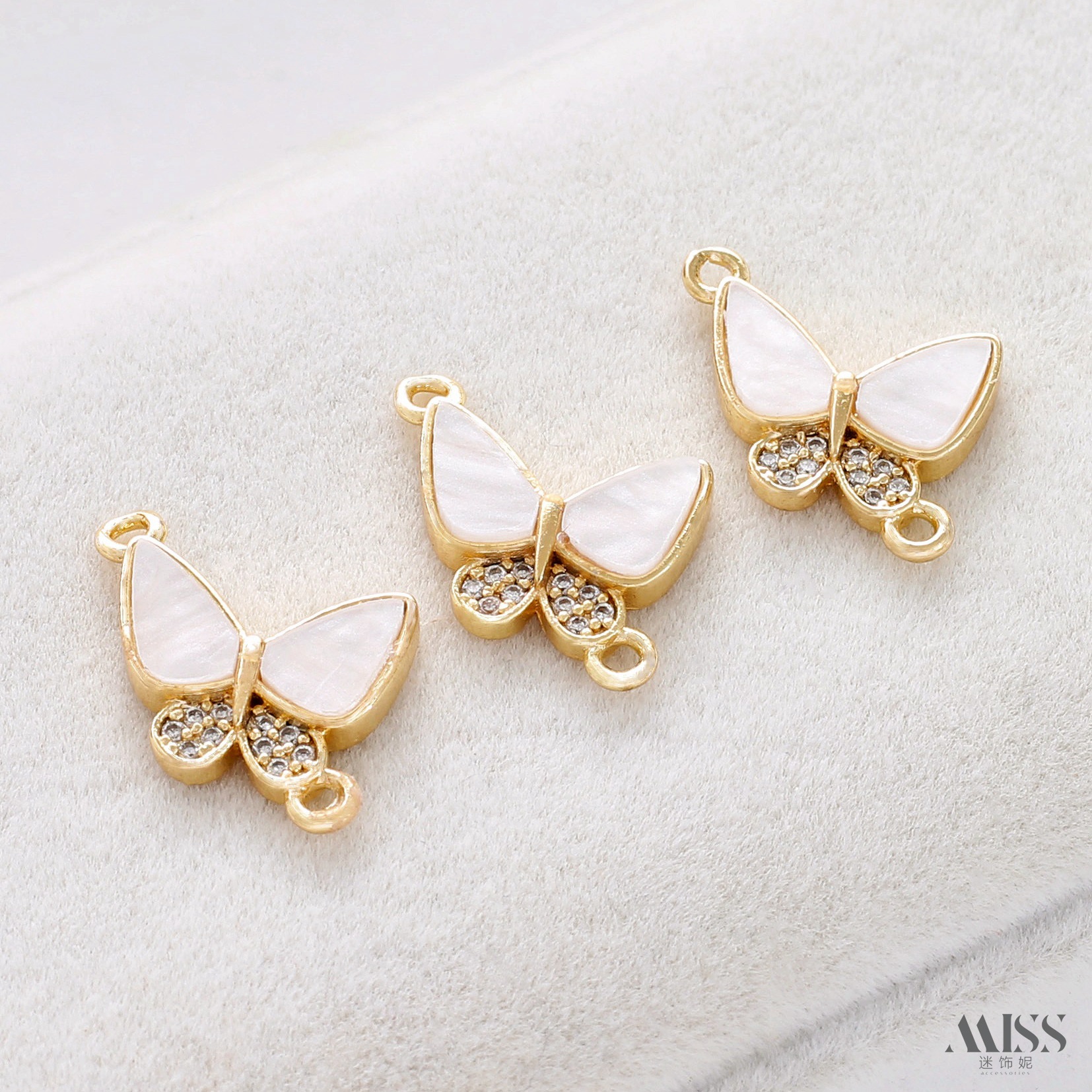 14K包金保色镶钻粘贝壳双吊蝴蝶吊坠diy连接件手链项链吊饰品配件