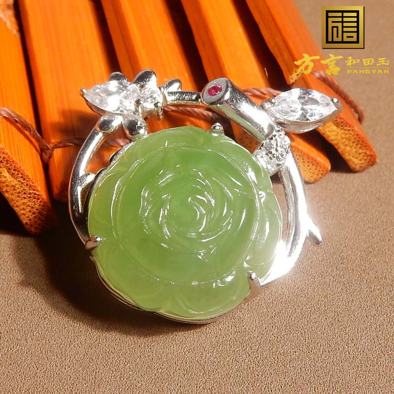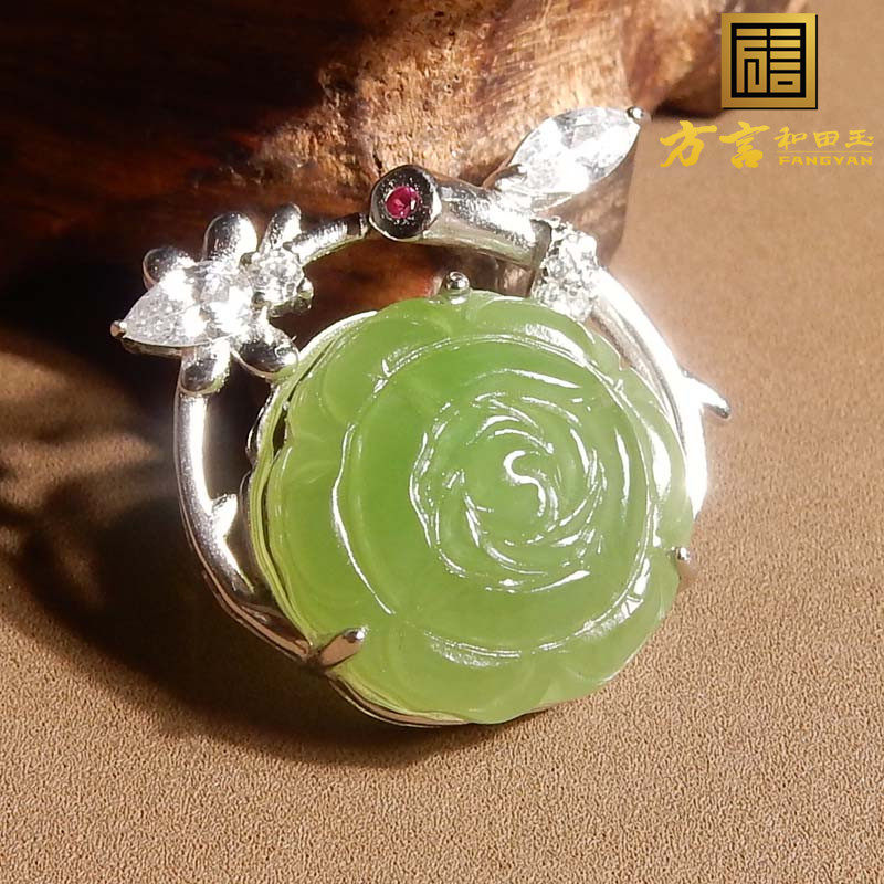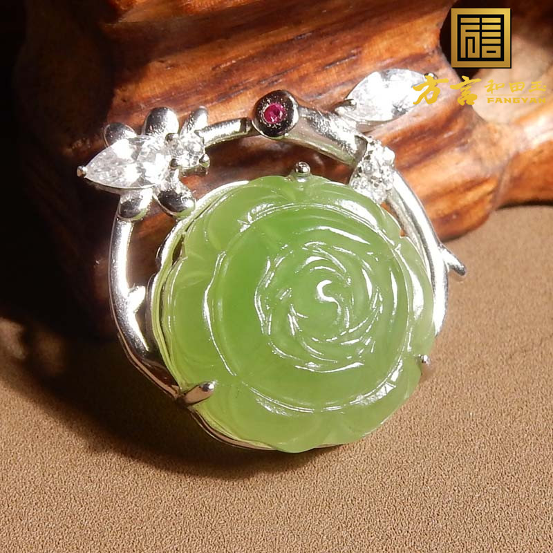 美爆了方言和田玉精品级俄料苹果绿绿碧玉银镶玫瑰花挂件吊坠s11