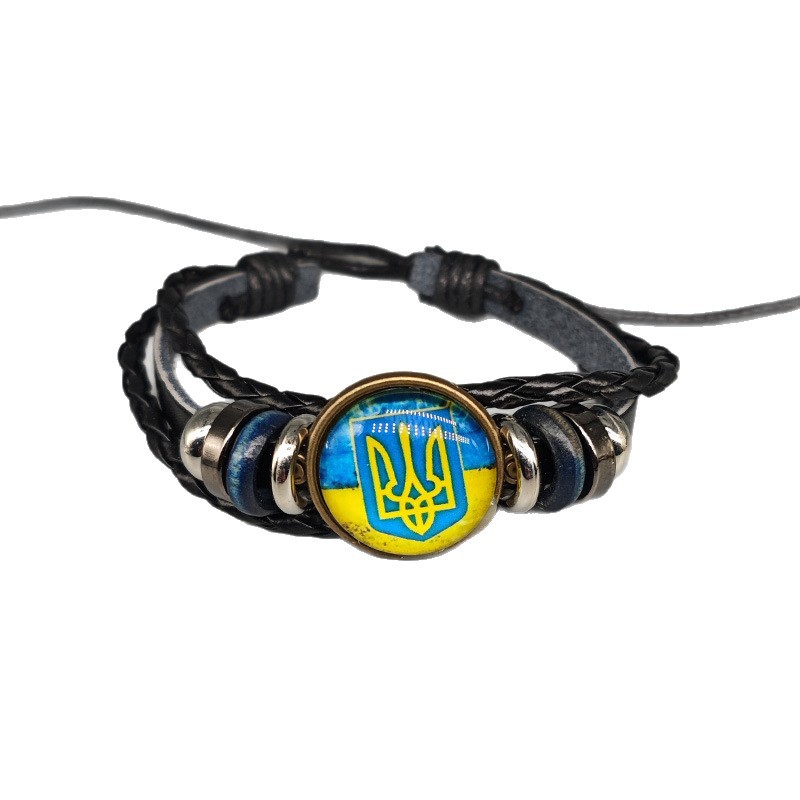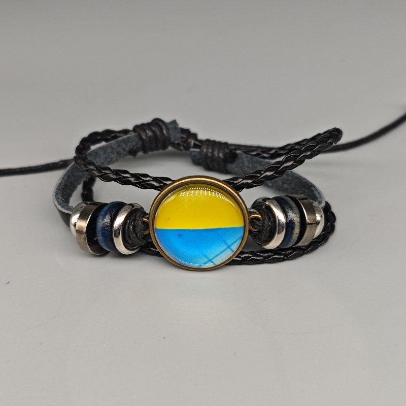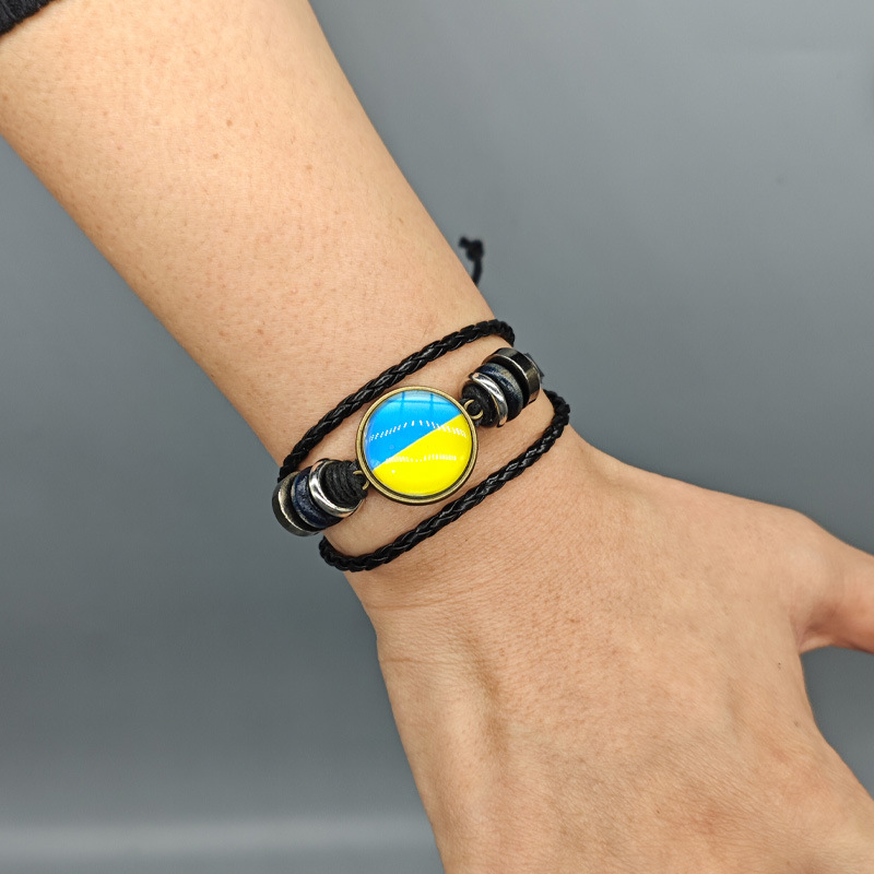简约时光宝石乌克兰国旗图案皮革手链跨境手工串珠编织手环黄蓝色
