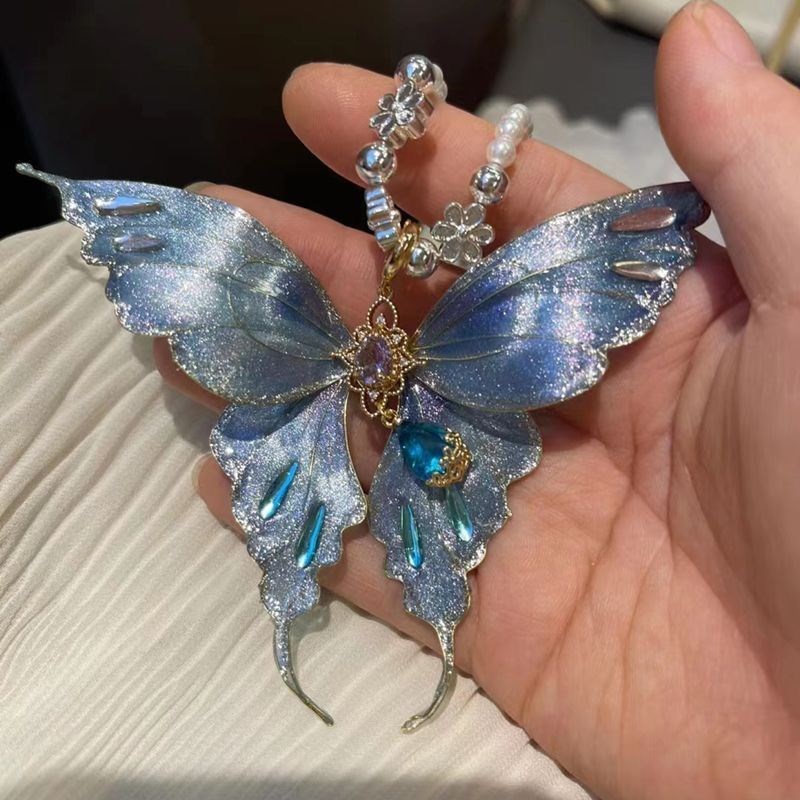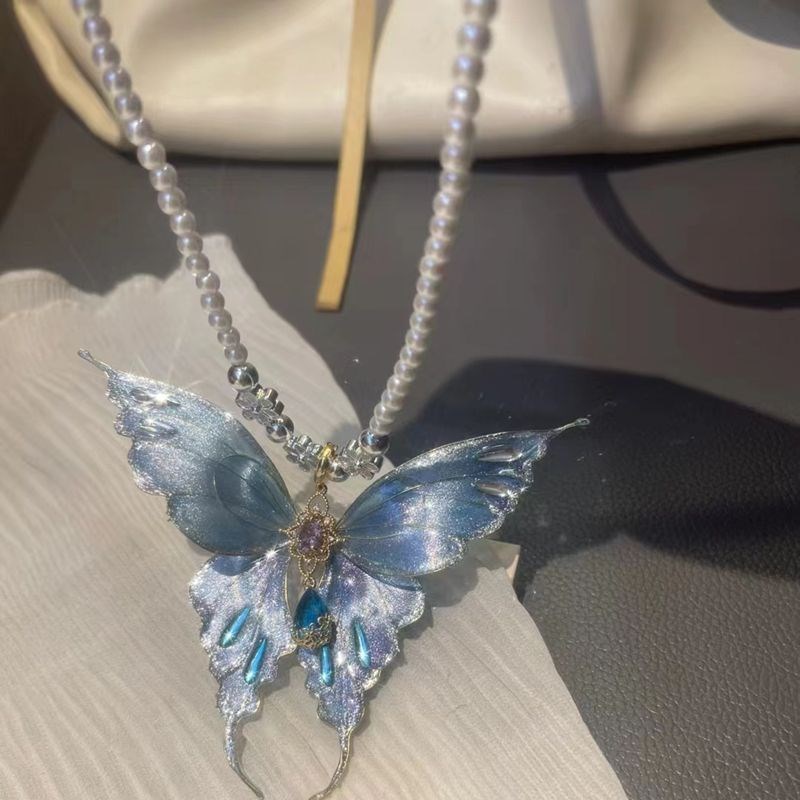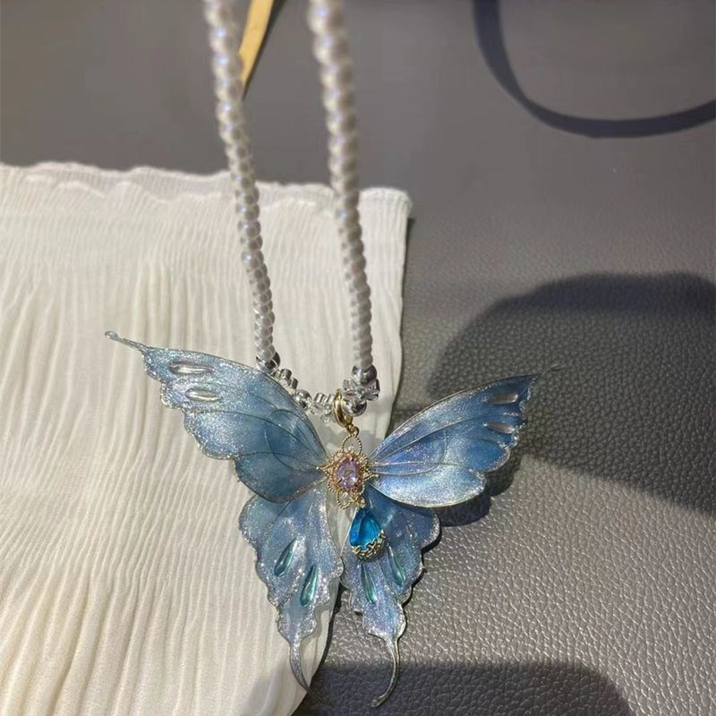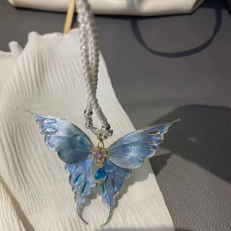 晴山蝴蝶 2024新款温柔治愈系高档珍珠幻彩蓝色吊坠蝴蝶项链