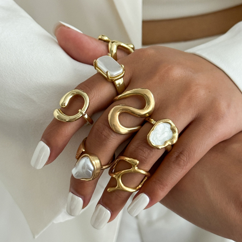 欧美跨境设计感不规则金属光面戒指套装 ins巴洛克仿珍珠开口指环