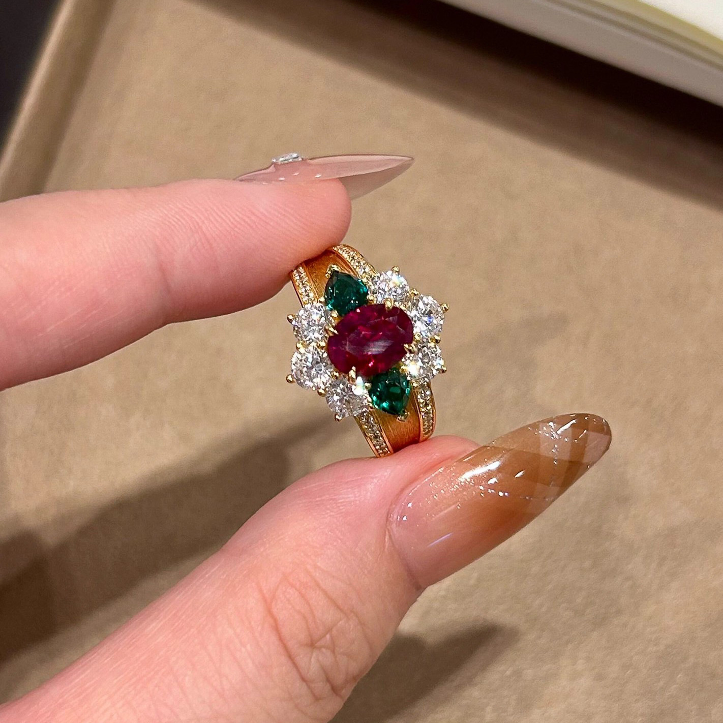 小红书同款轻奢优雅风红色绿宝石开口金戒指女高级感小众食指戒