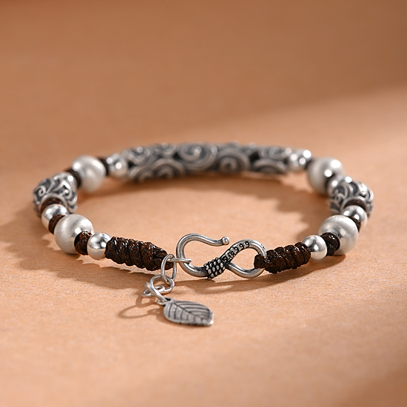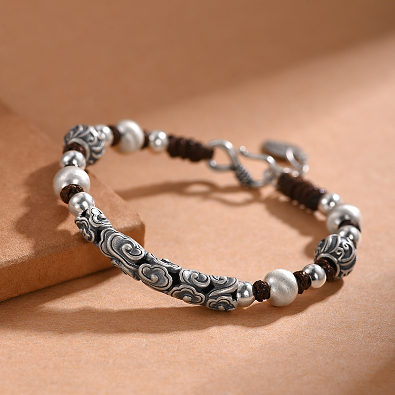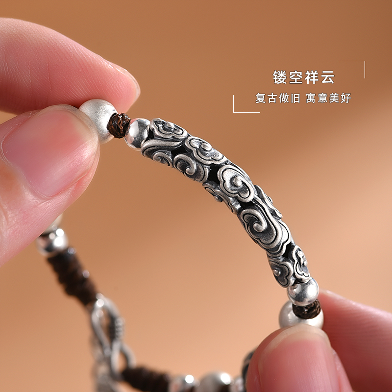 999纯银祥云纹串珠手链男女情侣款小众饰品手工编织本命年红手绳