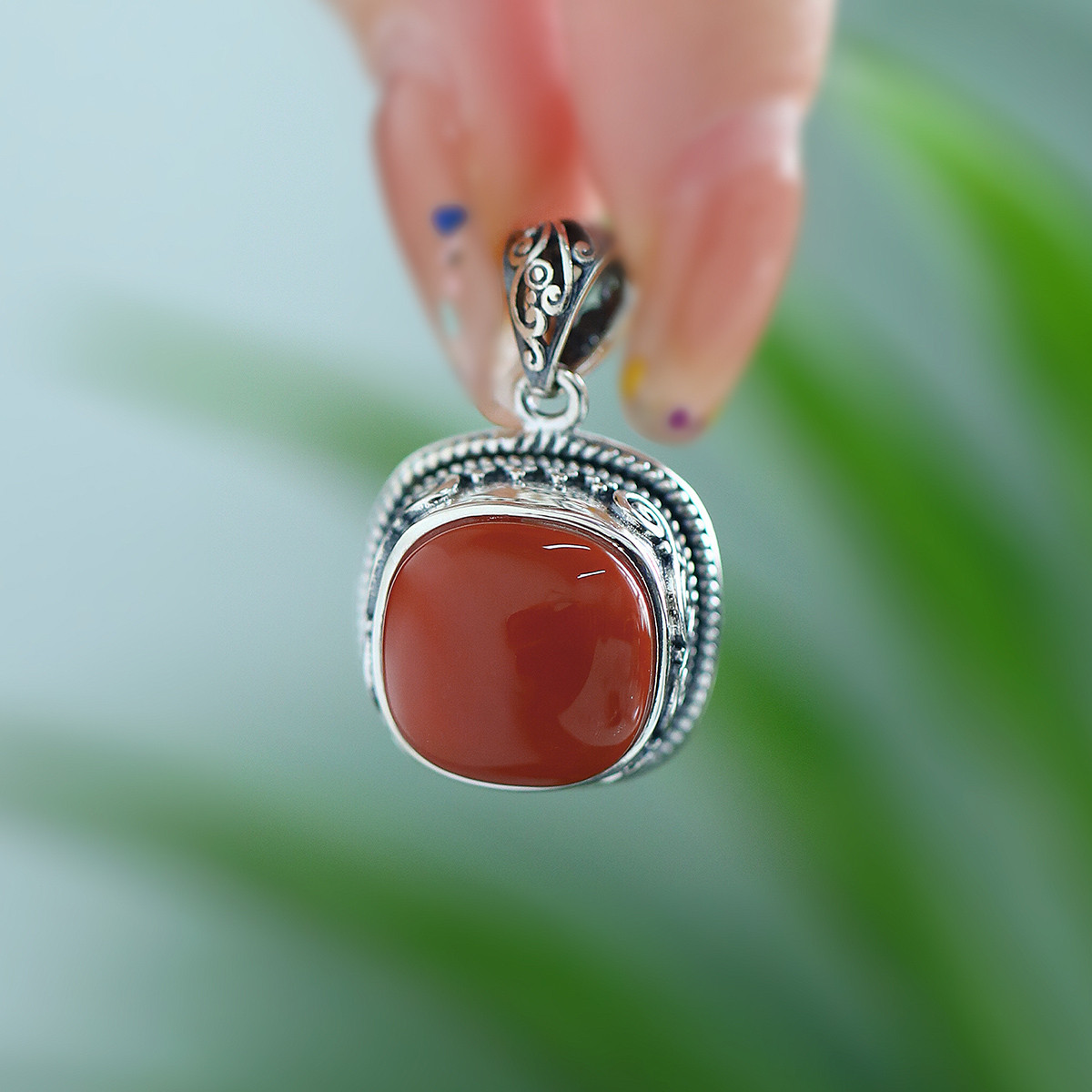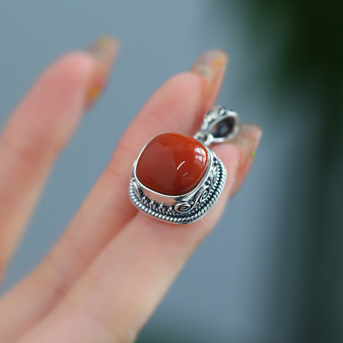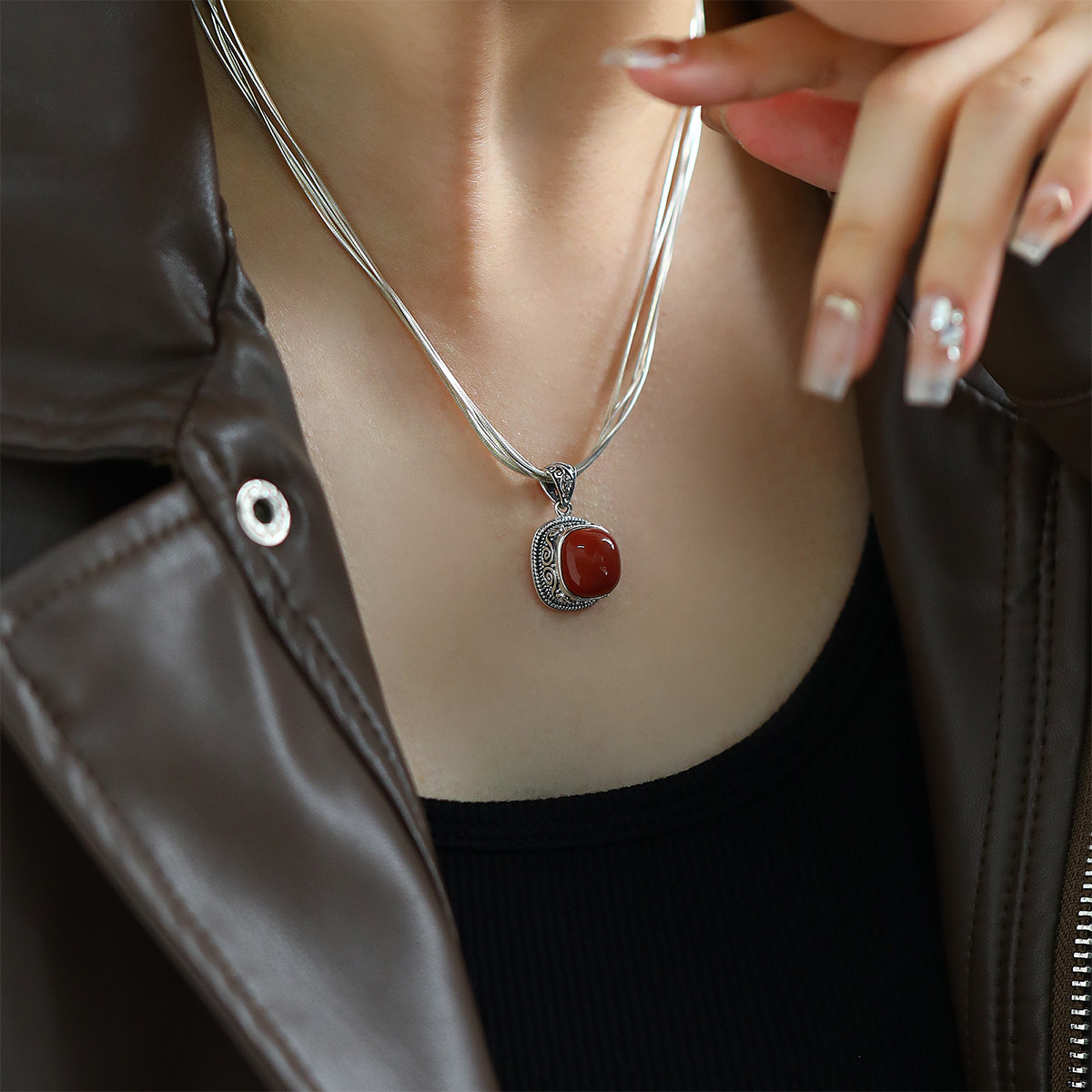 S925纯银复古国风南红几何吊坠女新中式民族风小众气质项链女