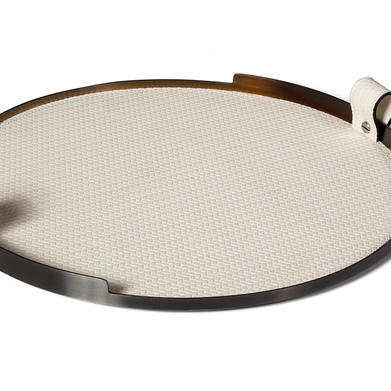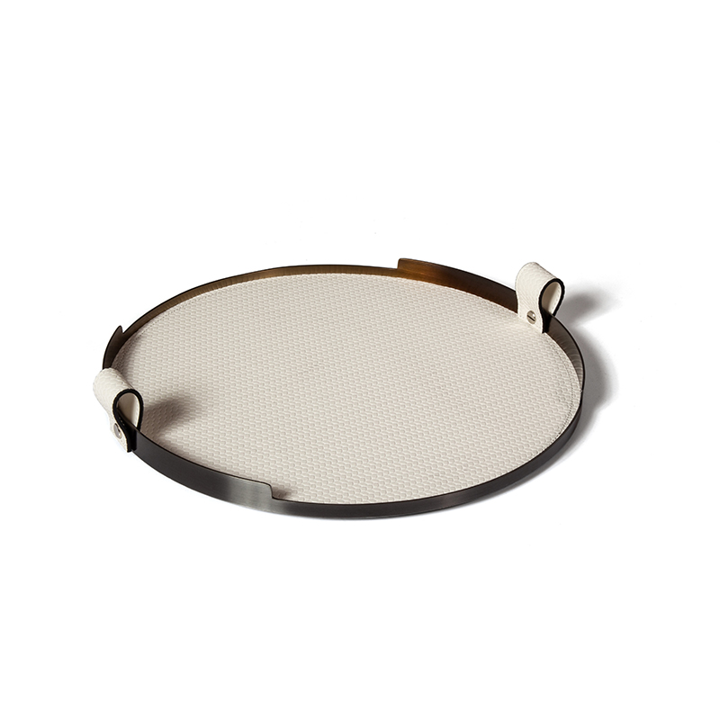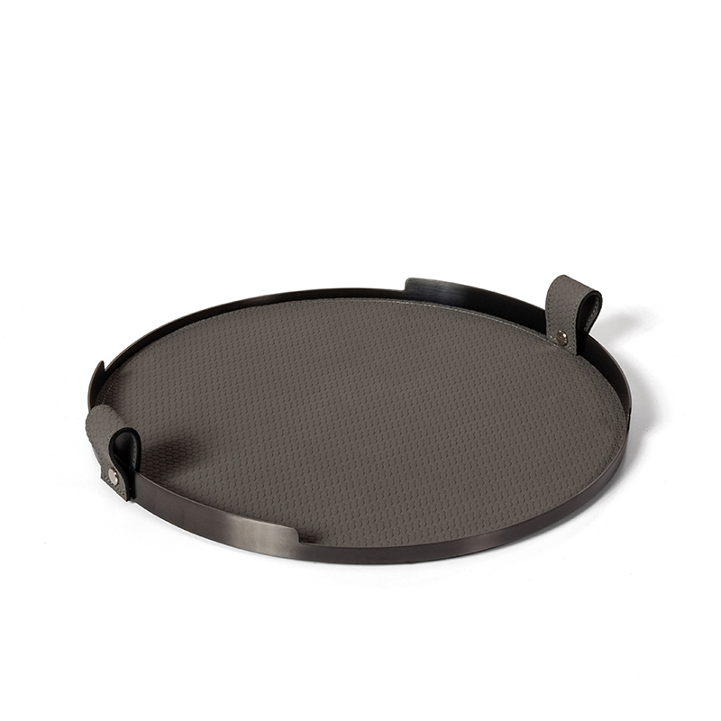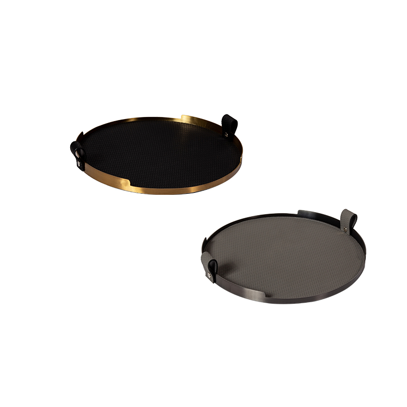 现代圆形编织皮质黑色金属托盘样板房家居客厅餐厅桌面收纳盘摆件