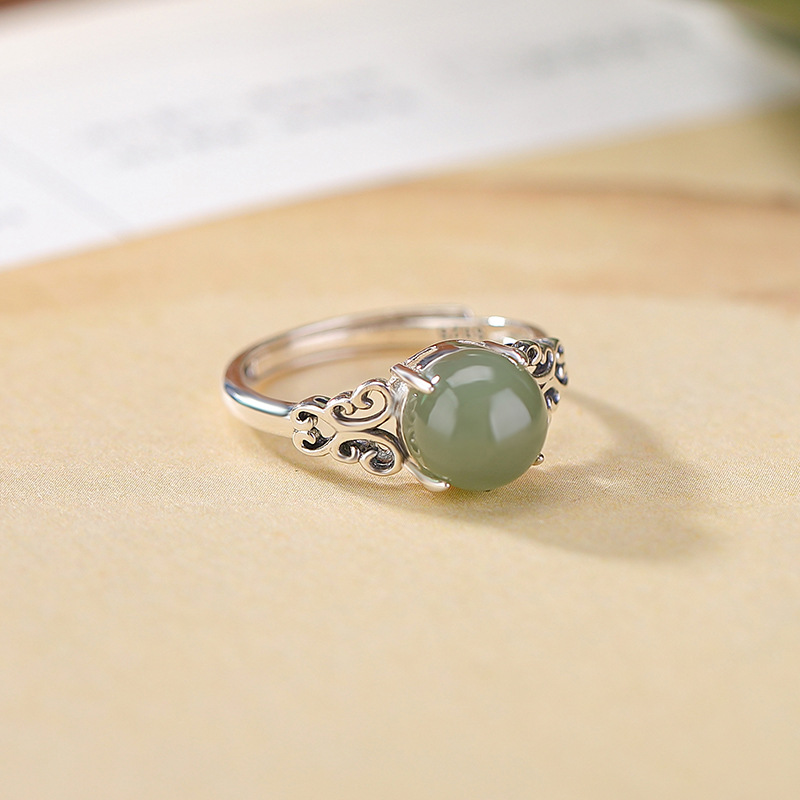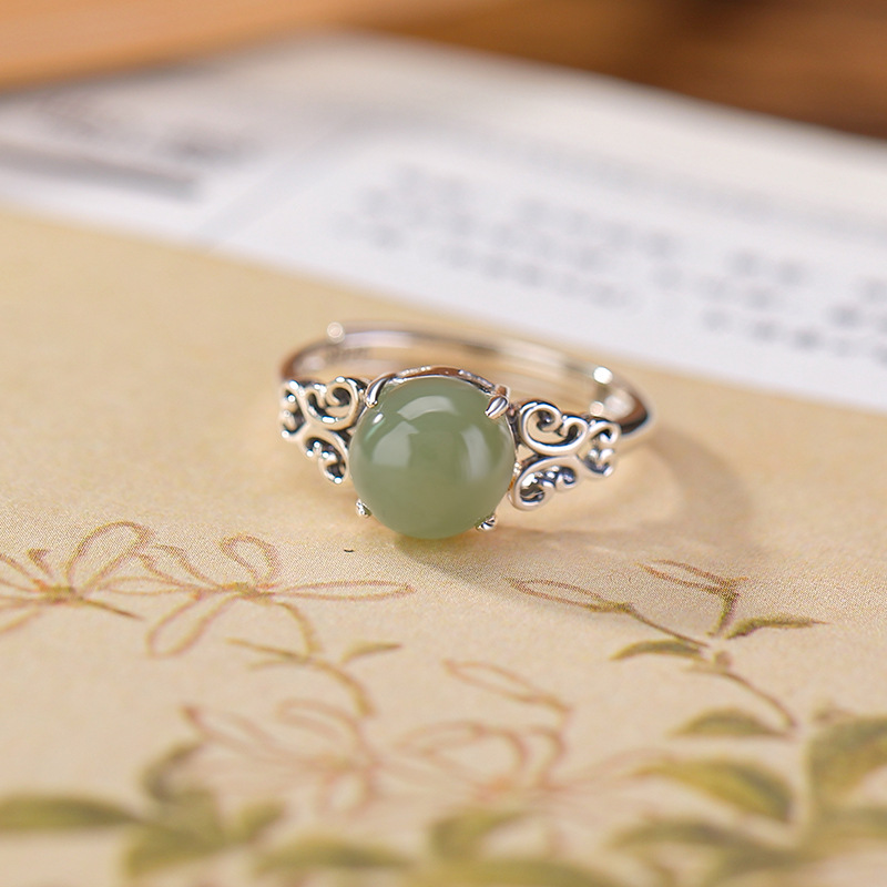 山予棠S925纯银天然和田玉晴水玉戒指复古亮面蝴蝶女士开口银指环