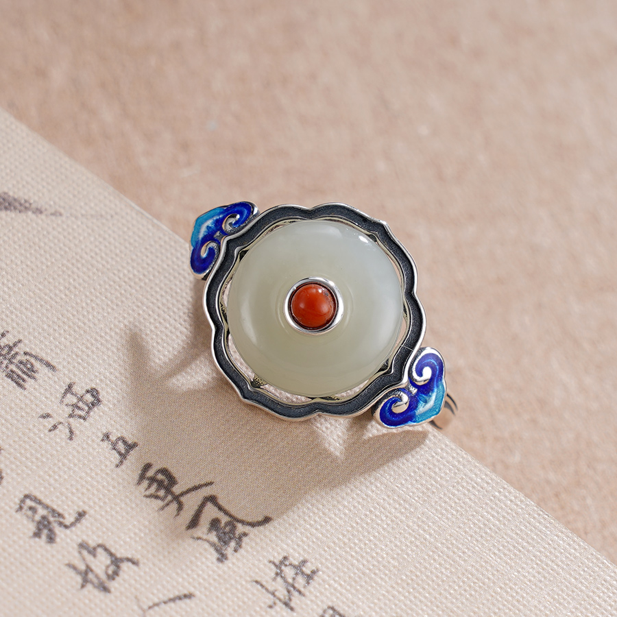 子佩集S925银【祥云相望】戒指【JZ01261】纯银和田玉珐琅彩平安