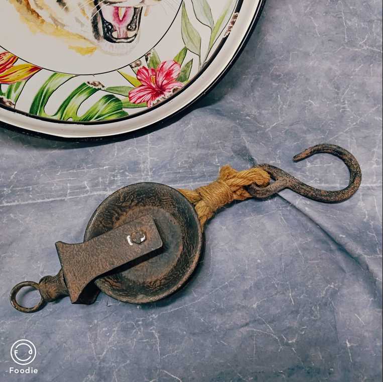 中古铁艺+麻绳滑轮造型装饰摆件孤品