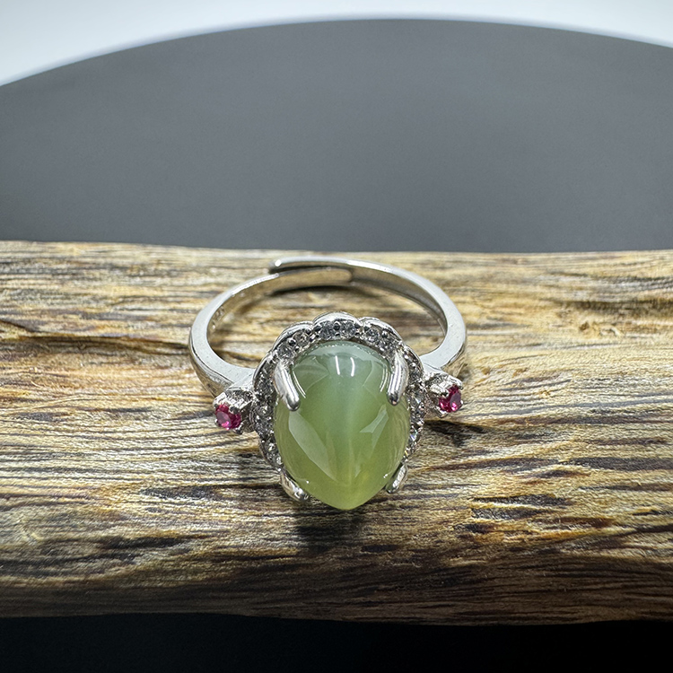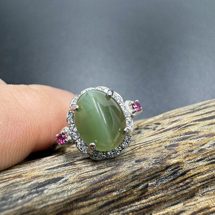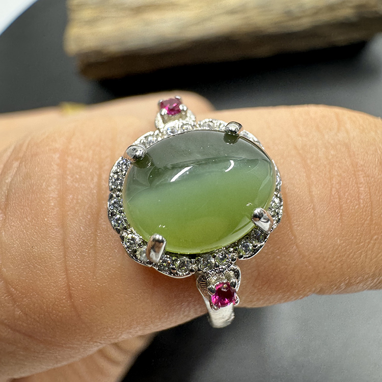 天然和田玉碧玉S925银镶嵌有猫眼带大蛋面戒指戒圈可调节闺蜜礼物