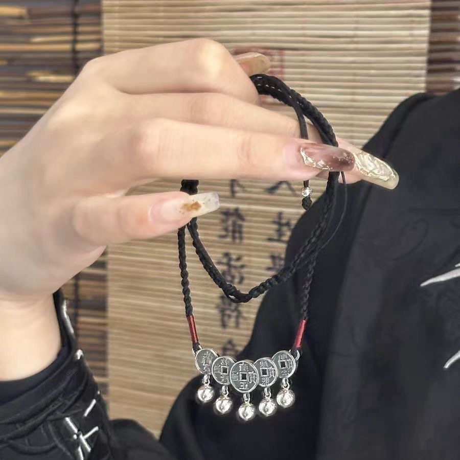 复古轻奢手工编织五帝钱币项链新款铃铛吊坠锁骨链新中式黑绳颈链
