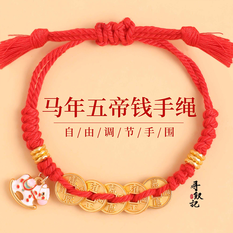 岑五帝钱马年手链红绳男女古法金五币铜钱盘缠手串本命年编绳手绳