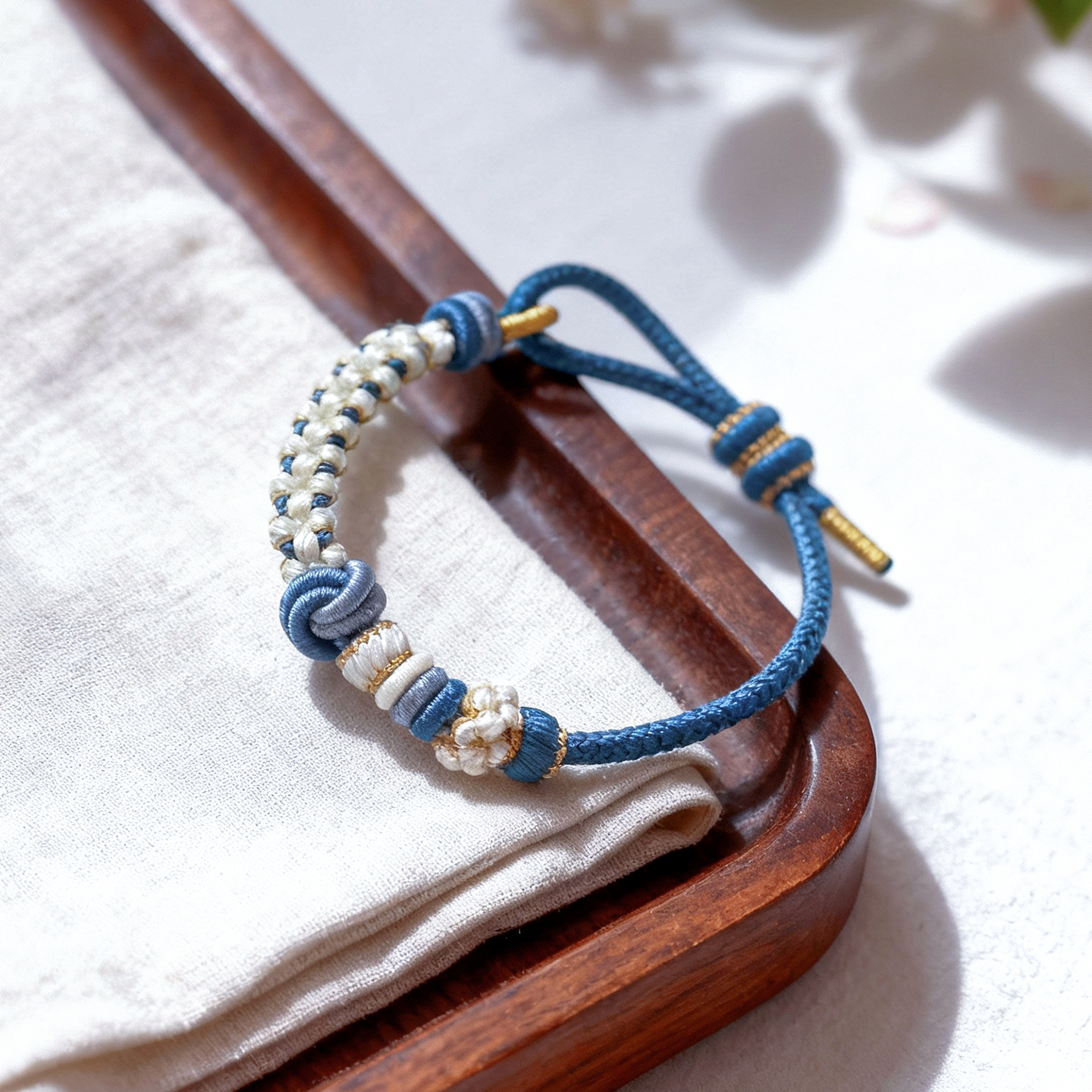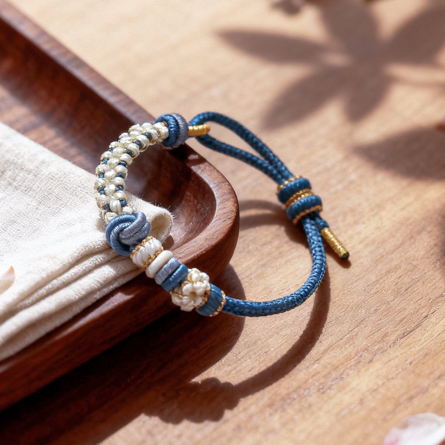 手工编织绳酒窝结手绳有钱花蓝色可穿珠黄金转运珠可调节编绳手链