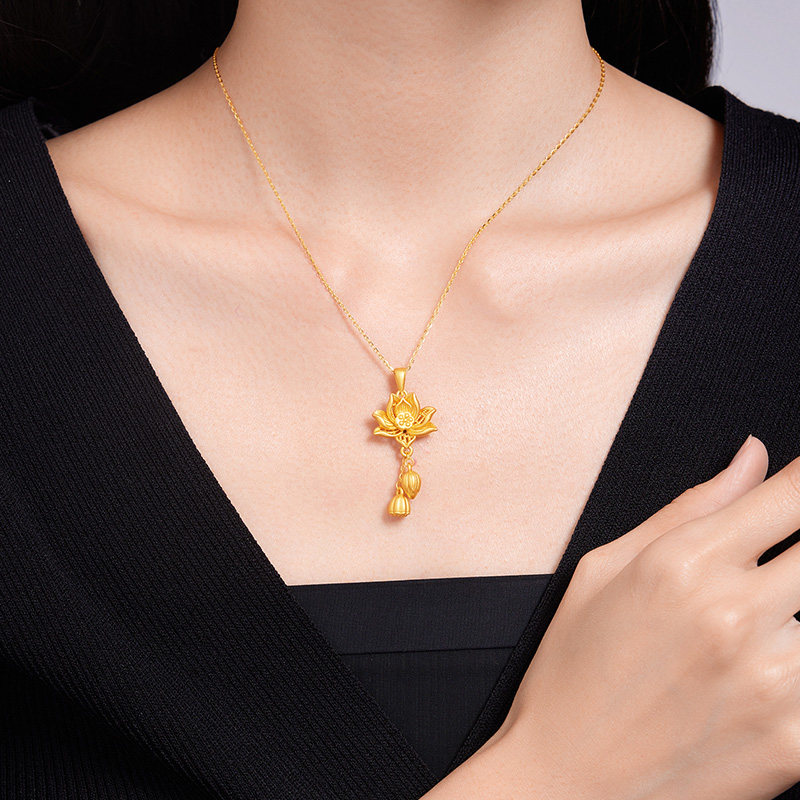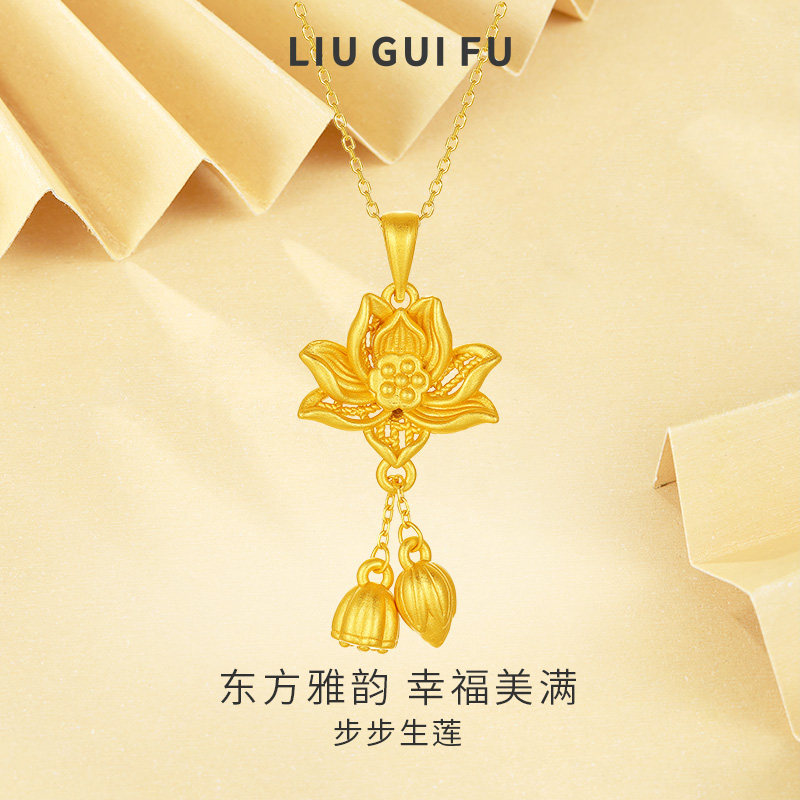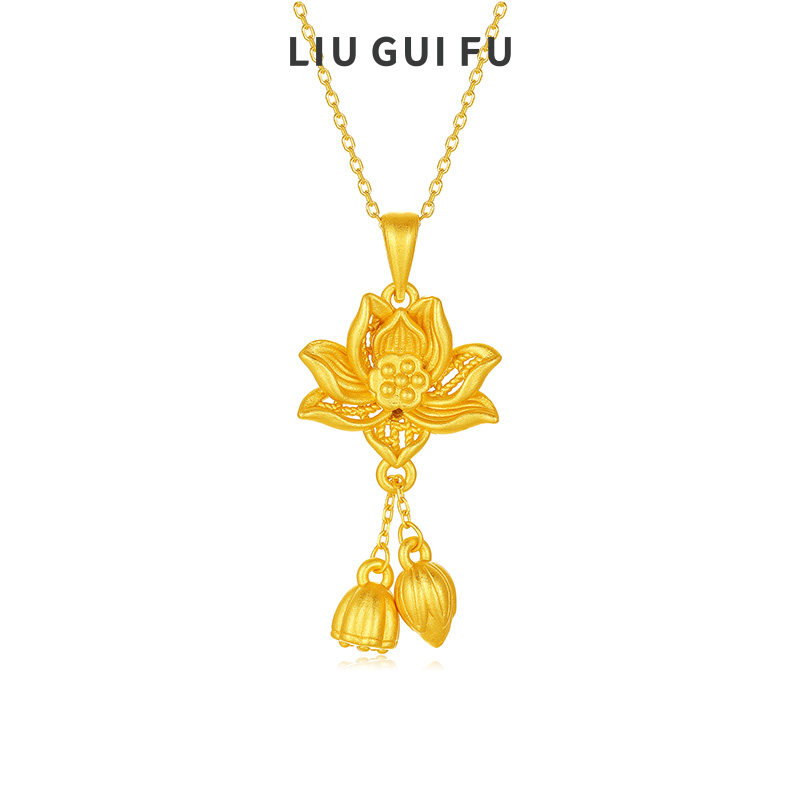 六桂福珠宝古法莲花吊坠女款莲花纯银项链S925银套链礼物送女生