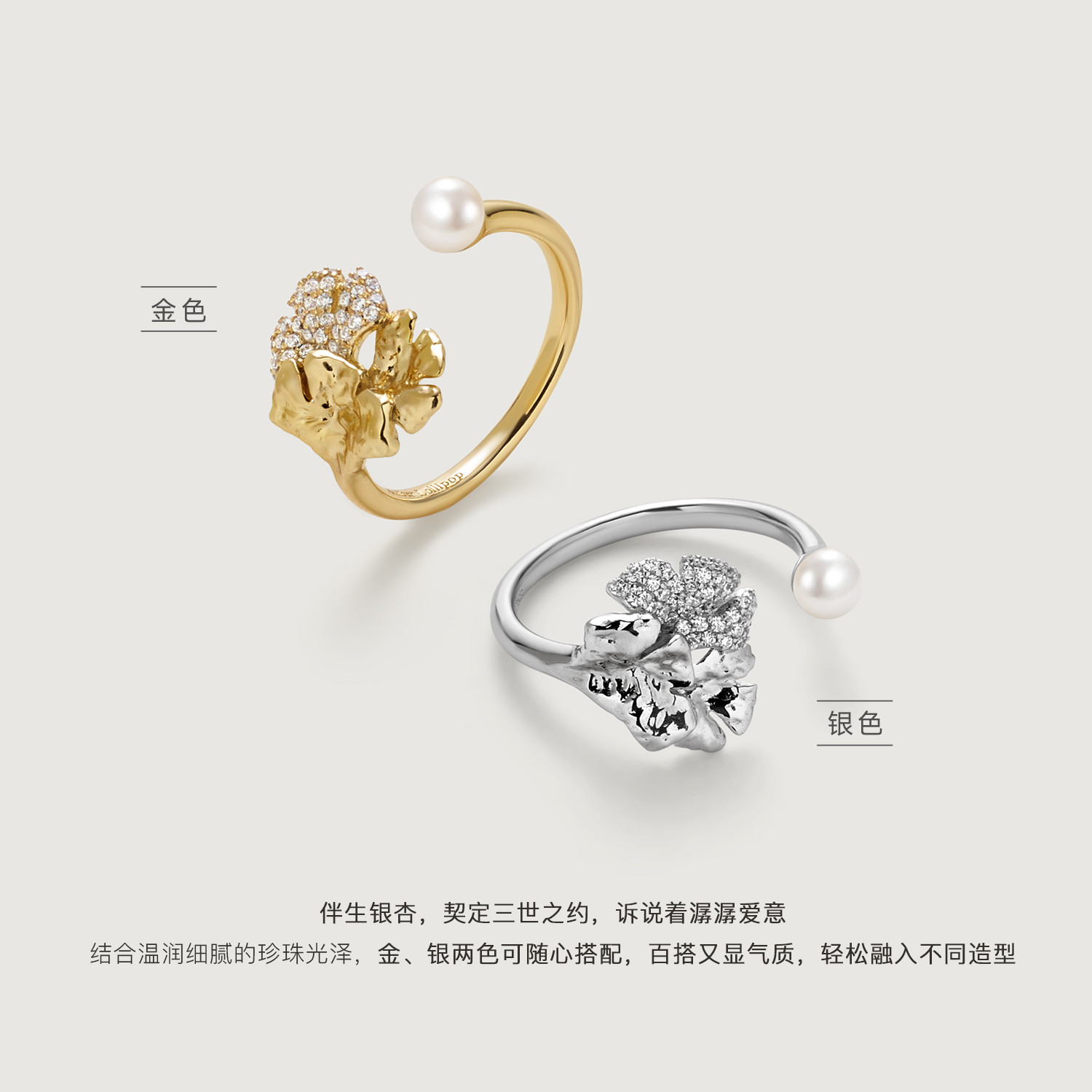 AmberLollipop银杏叶珍珠戒指女小众设计开口食指戒新款 迎幸系列