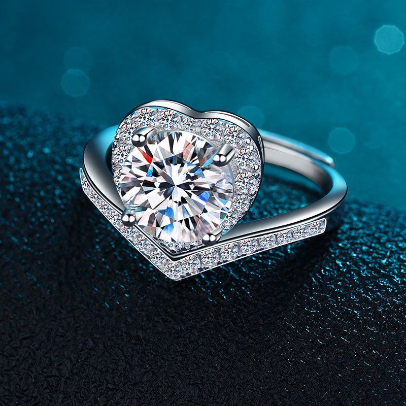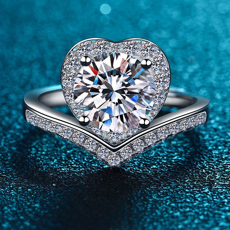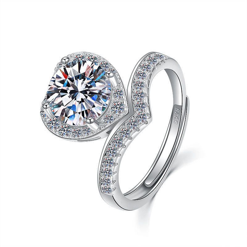 S925纯银爱心V形戒指女韩版轻奢时尚2克拉钻戒小众设计排钻开口戒