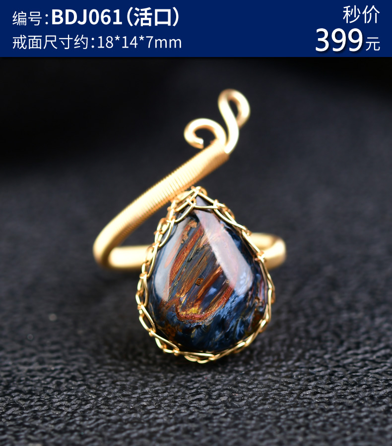 天然水晶纳米比亚彼得石蓝色彩色纯银戒指开口 男女款猫生日礼物