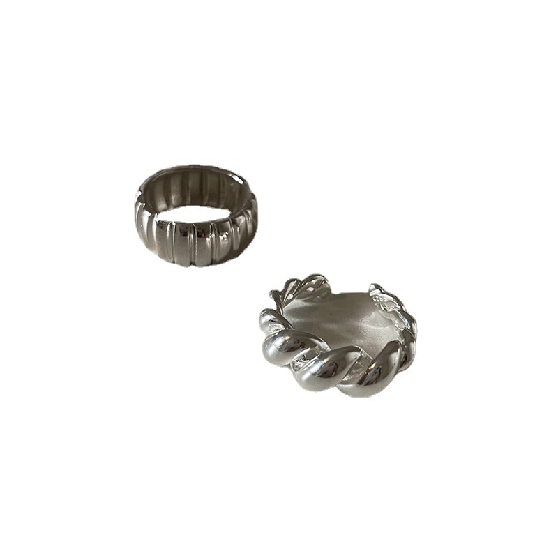 韩版S925镀银麻花镂空戒指女复古时尚竖纹牛角包开口指环嘻哈食指
