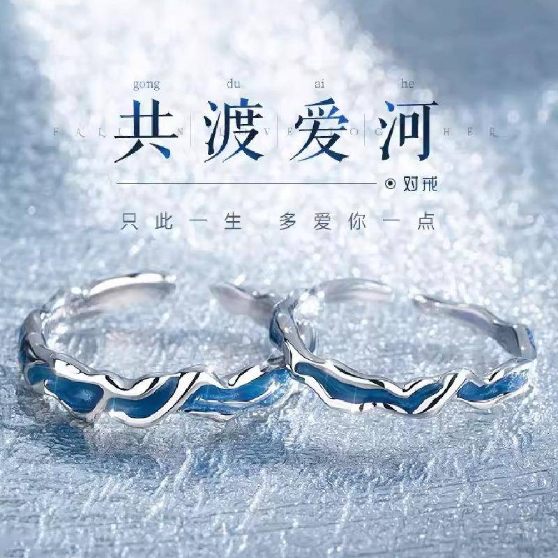 共渡爱河情侣戒指男女一对款小众设计感不规则褶皱蓝色开口指环