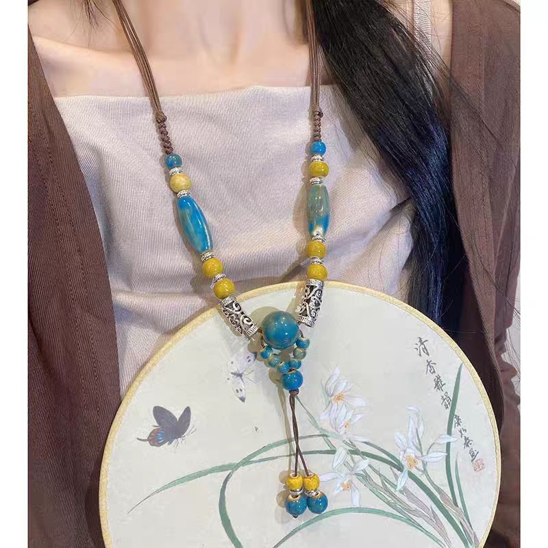 波西米亚陶瓷彩色串珠海星项链女款复古民族风编织绳长款夏天配饰