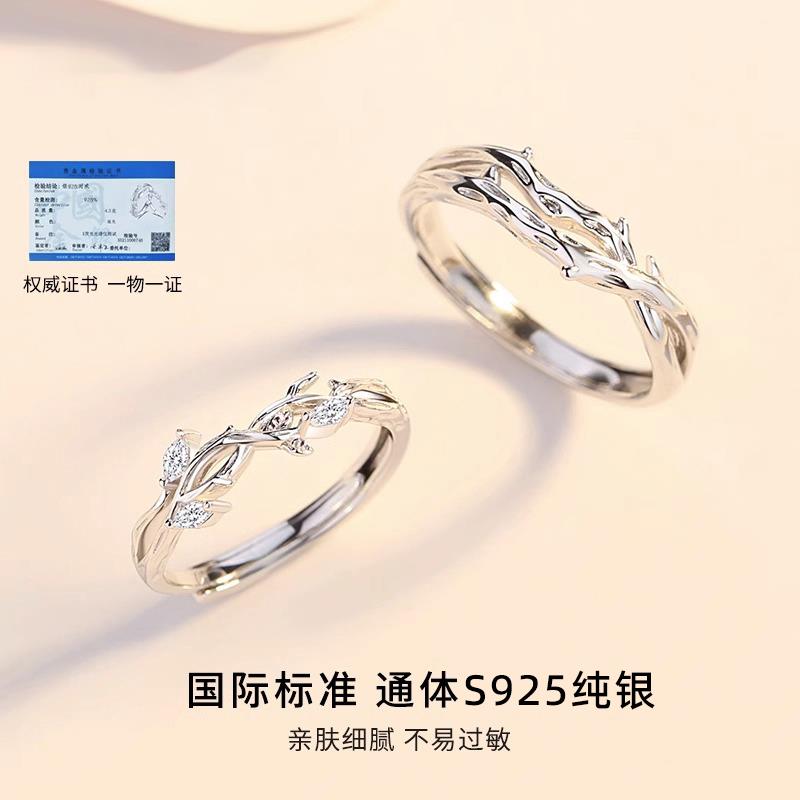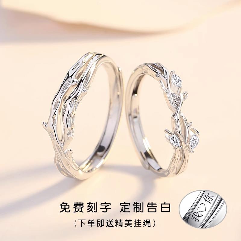 连理枝情侣对戒999纯银一对款戒指定情信物2024年新款刻字可调节