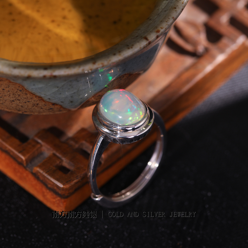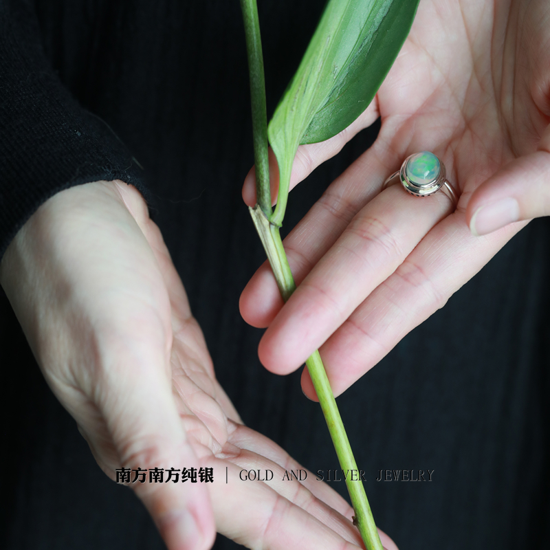 灿烂纯银饰品天然欧泊石复古风轻奢百搭女款时尚设计感开口戒指