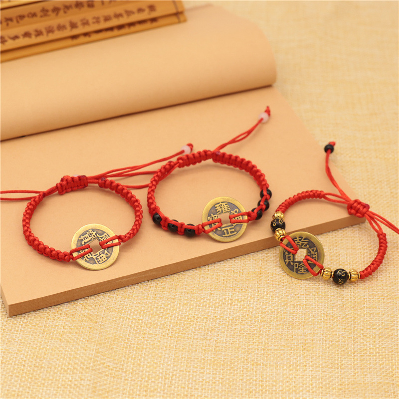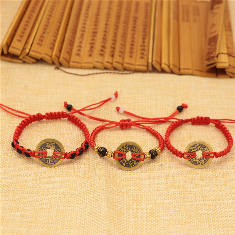 五帝钱手链本命年铜钱红绳开运招财手工编织绳男女款手饰六字真言