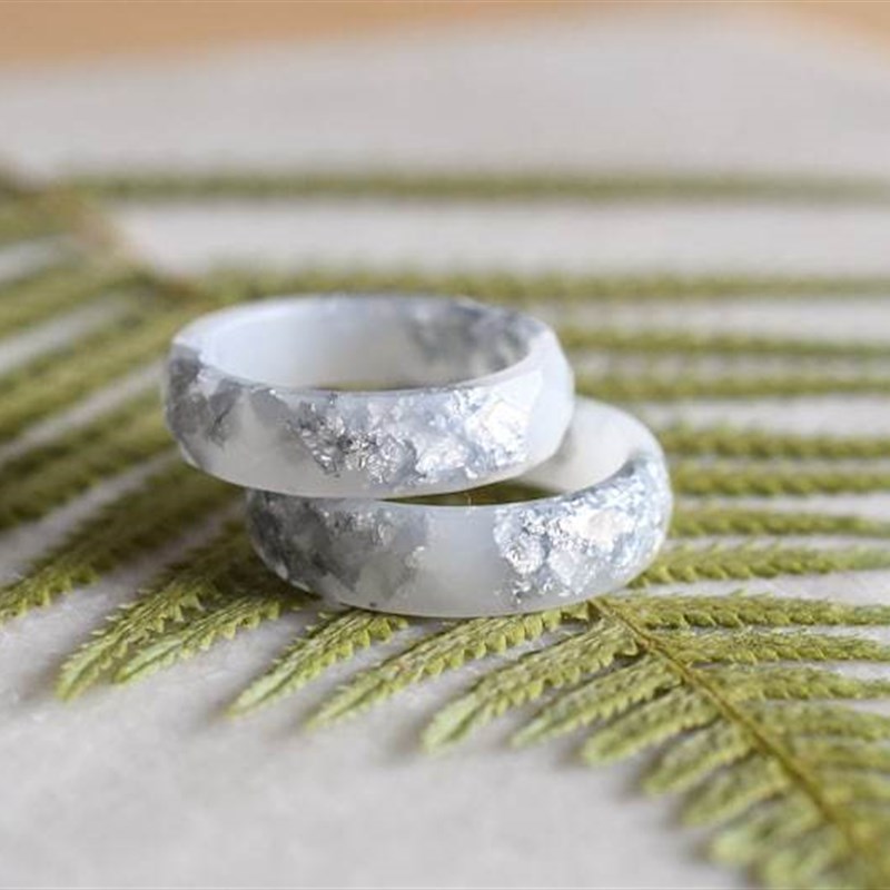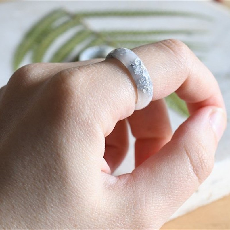 带银片的白色刻面树脂戒指 - 冬季彩色刻面M戒指 - 另类订婚戒指