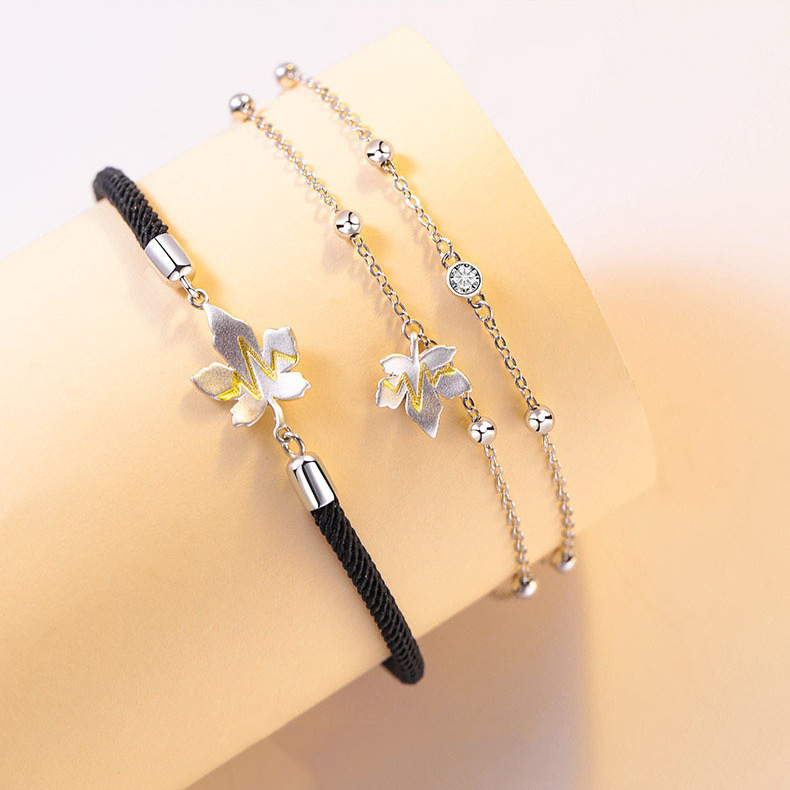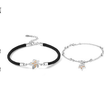 新款枫叶情侣手链对男女生双层镀银小众设计感情侣款黑色编织手绳