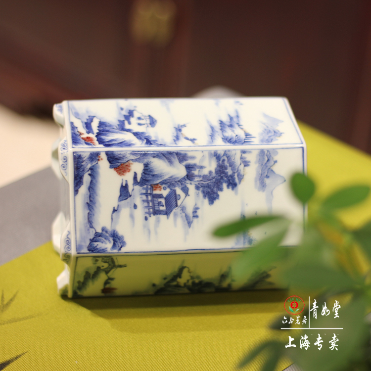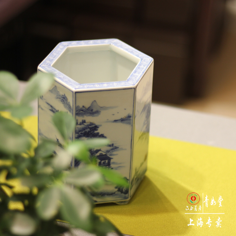 【青如堂】精品青花釉里红山水同景六方大笔筒 六合茗居