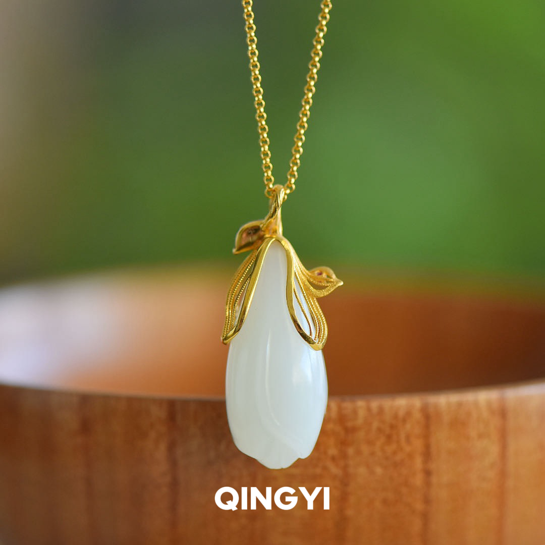 天然正品新疆和田玉羊脂玉玉兰花吊坠18k金镶嵌玉石挂件送女友