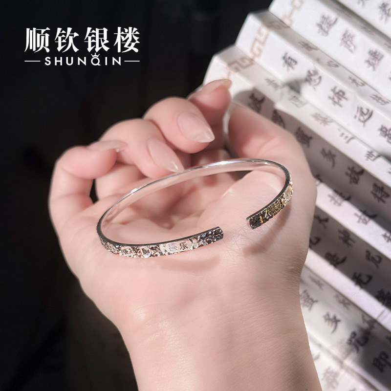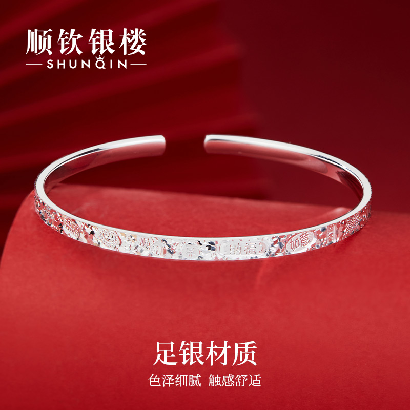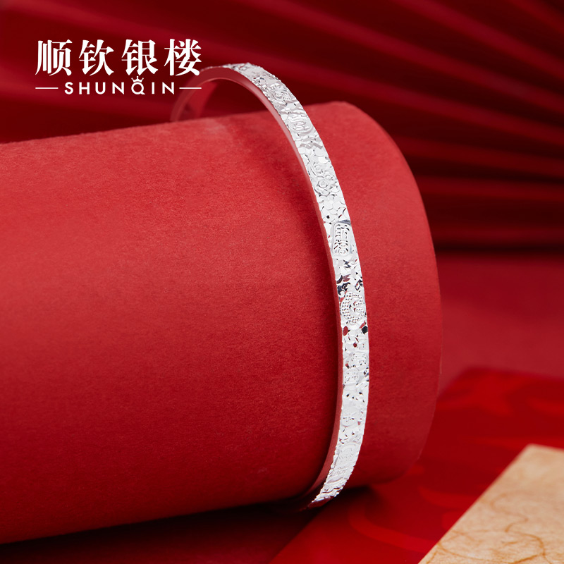 顺钦银楼S9999纯银手镯女新中式吉祥碎冰冰足银镯子好运生日礼物