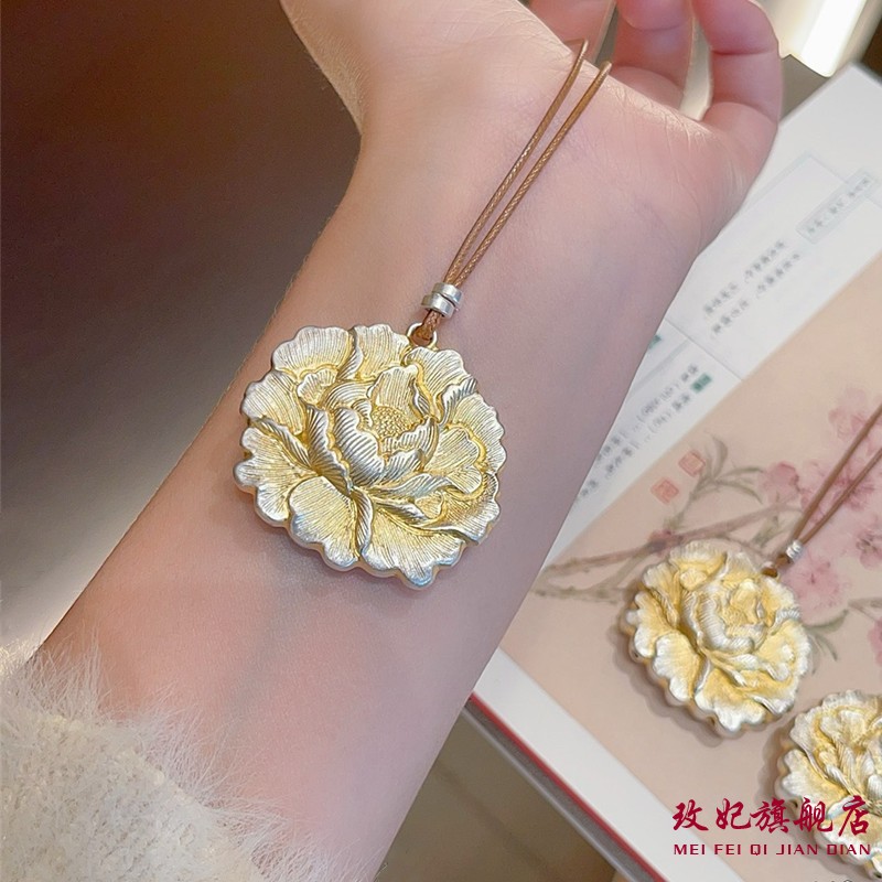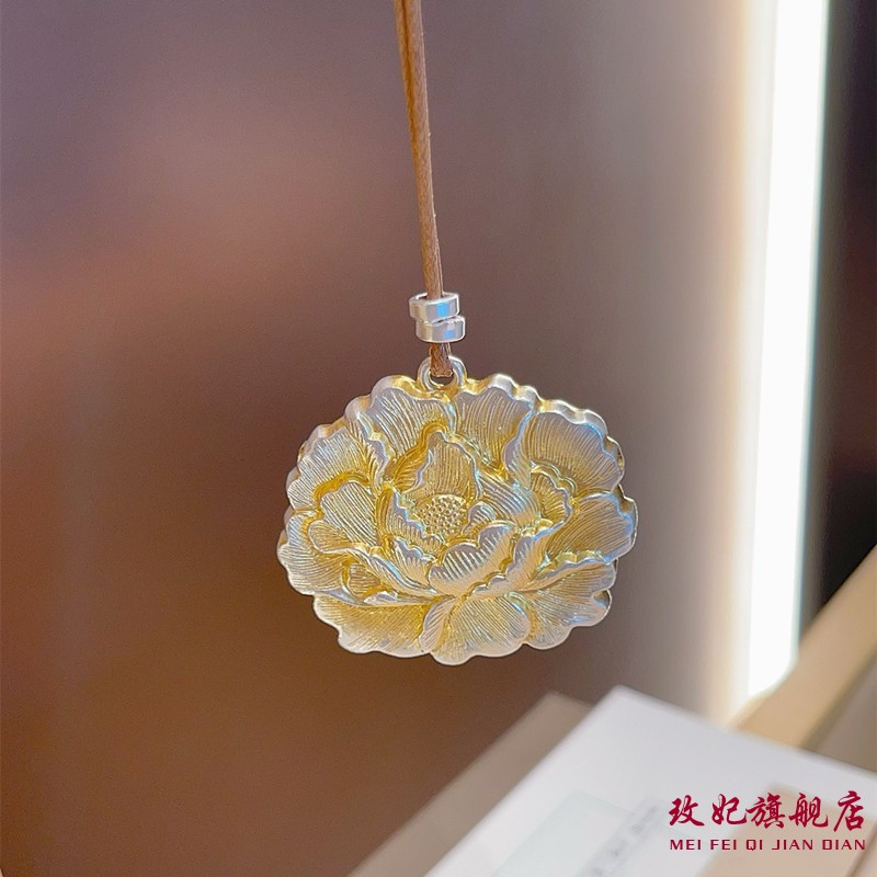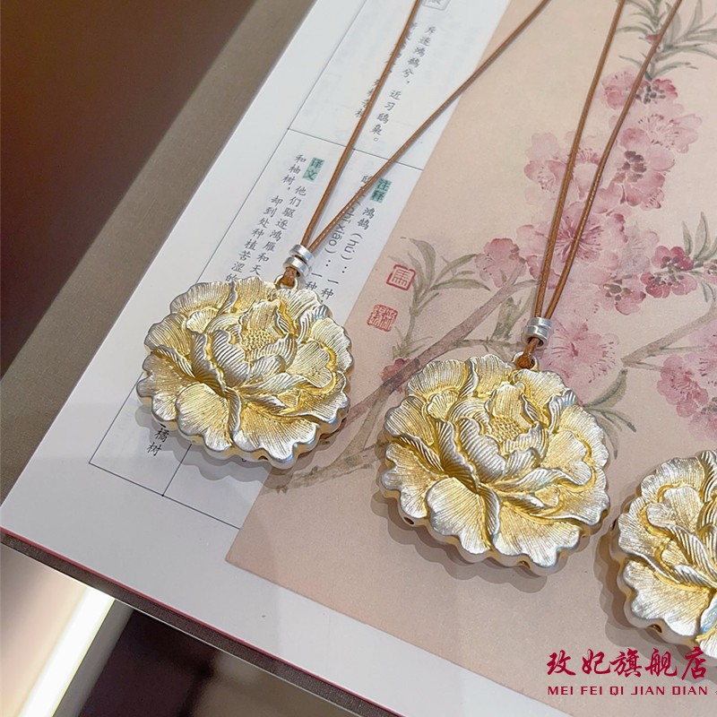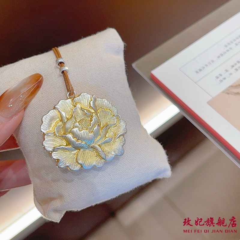 玫妃牡丹花描金纯银项链足银9999新中式编织绳毛衣链送女友礼物