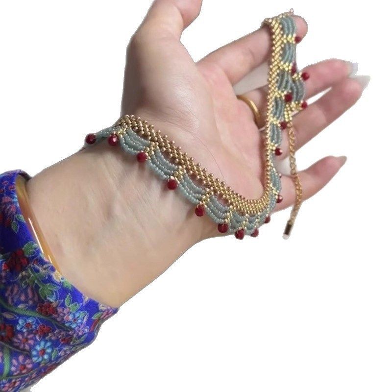 2025新款多层蕾丝红蓝撞色串珠项链女民族风复古宫廷颈链