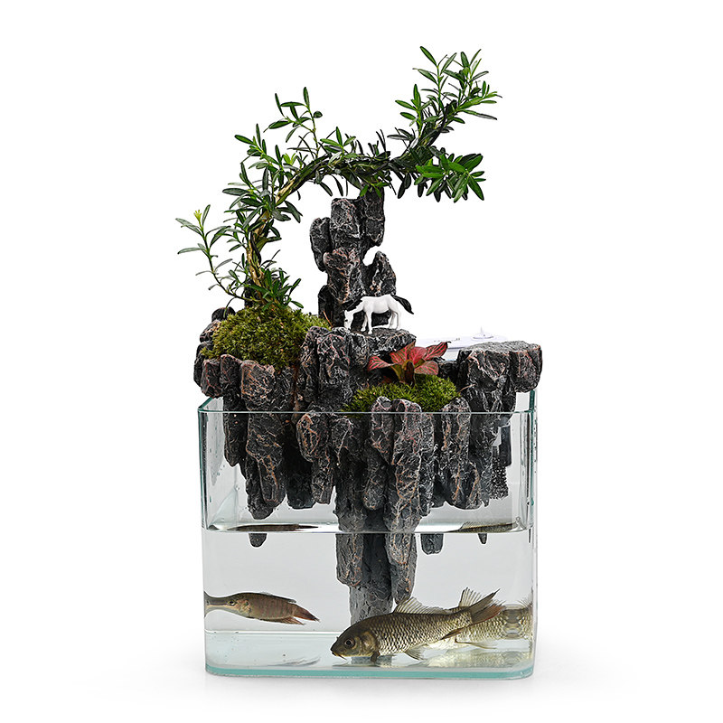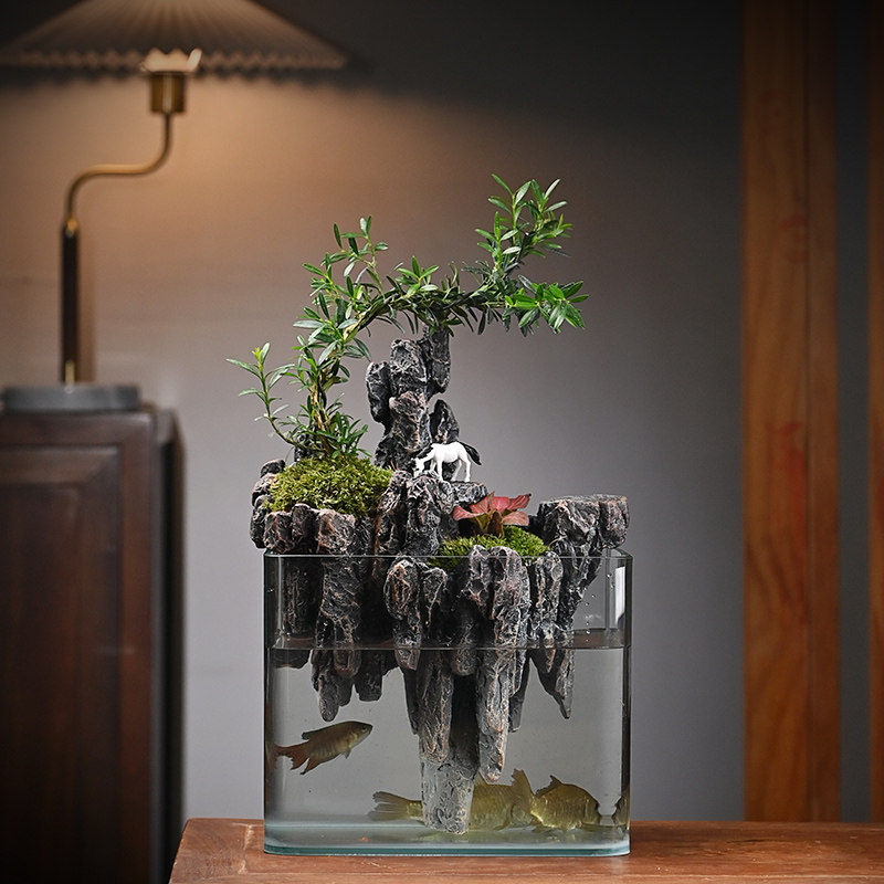 假山流水鱼缸造景黄杨绿植摆件创意办公室客厅桌面水循环开业礼品