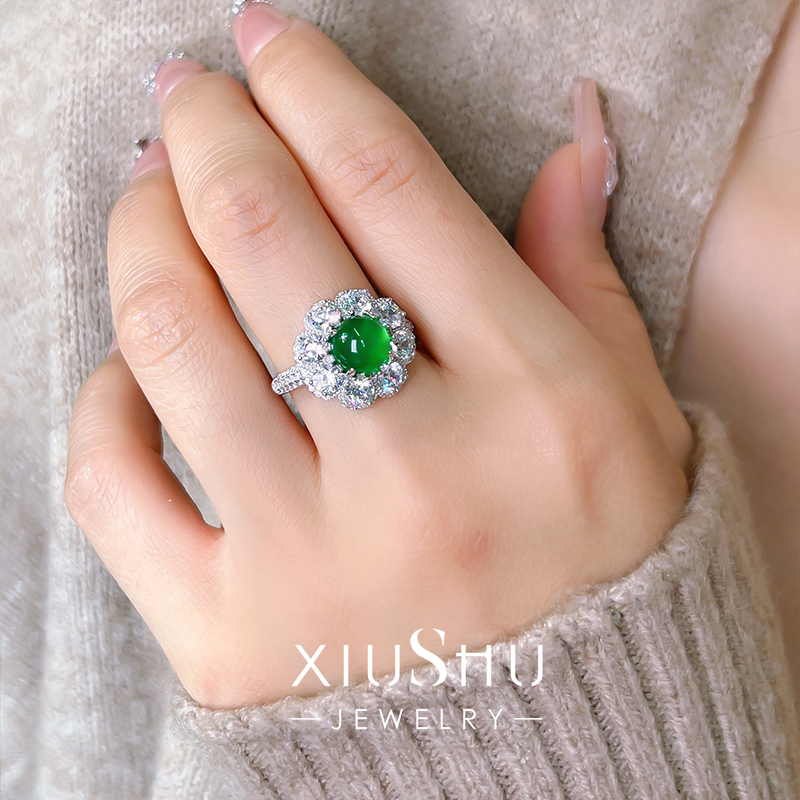 新中式绿玉髓太阳花925纯银戒指女士荧光媲美翡翠气质小众高级感