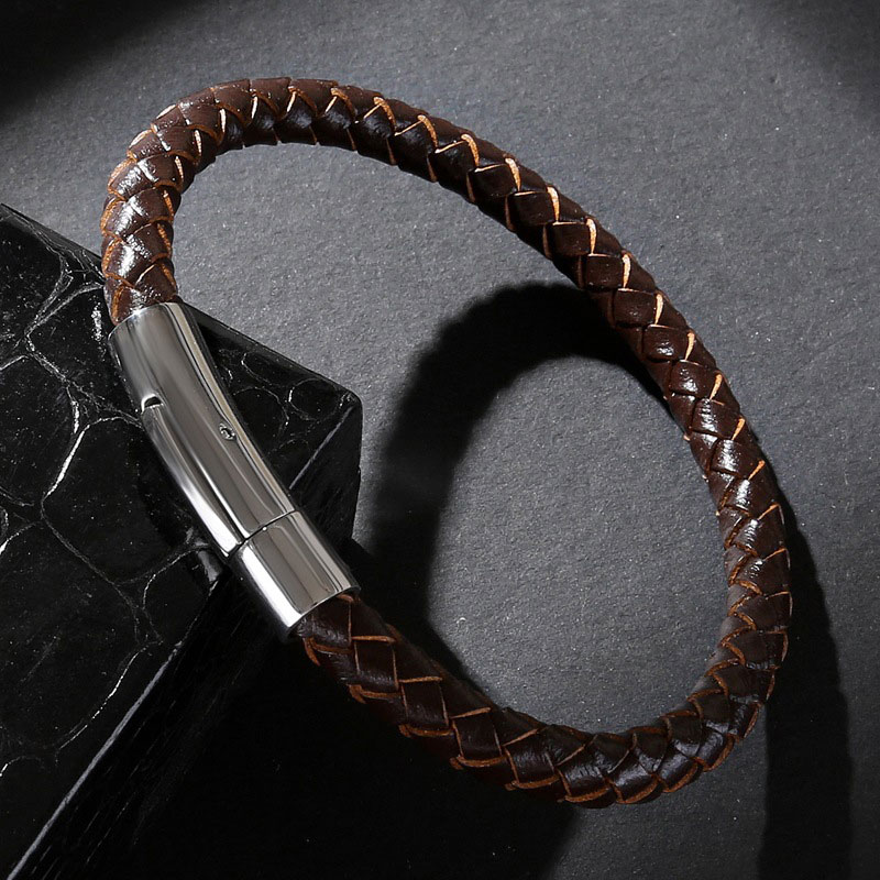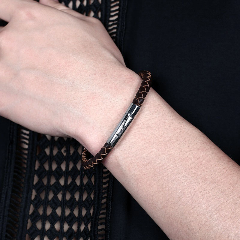 日韩简约男士皮绳手链 编织黑色牛皮手环 韩版复古学生钛钢手绳女