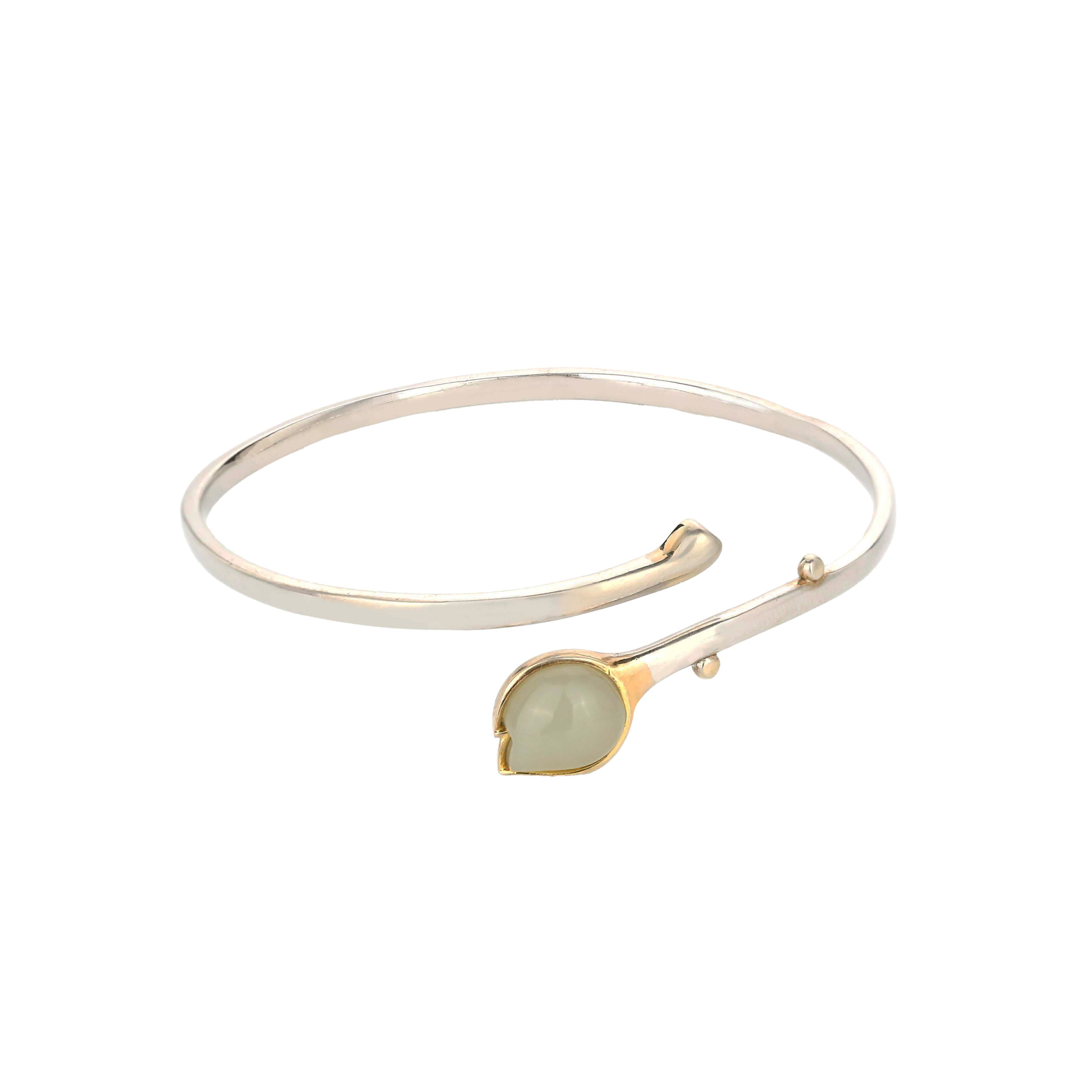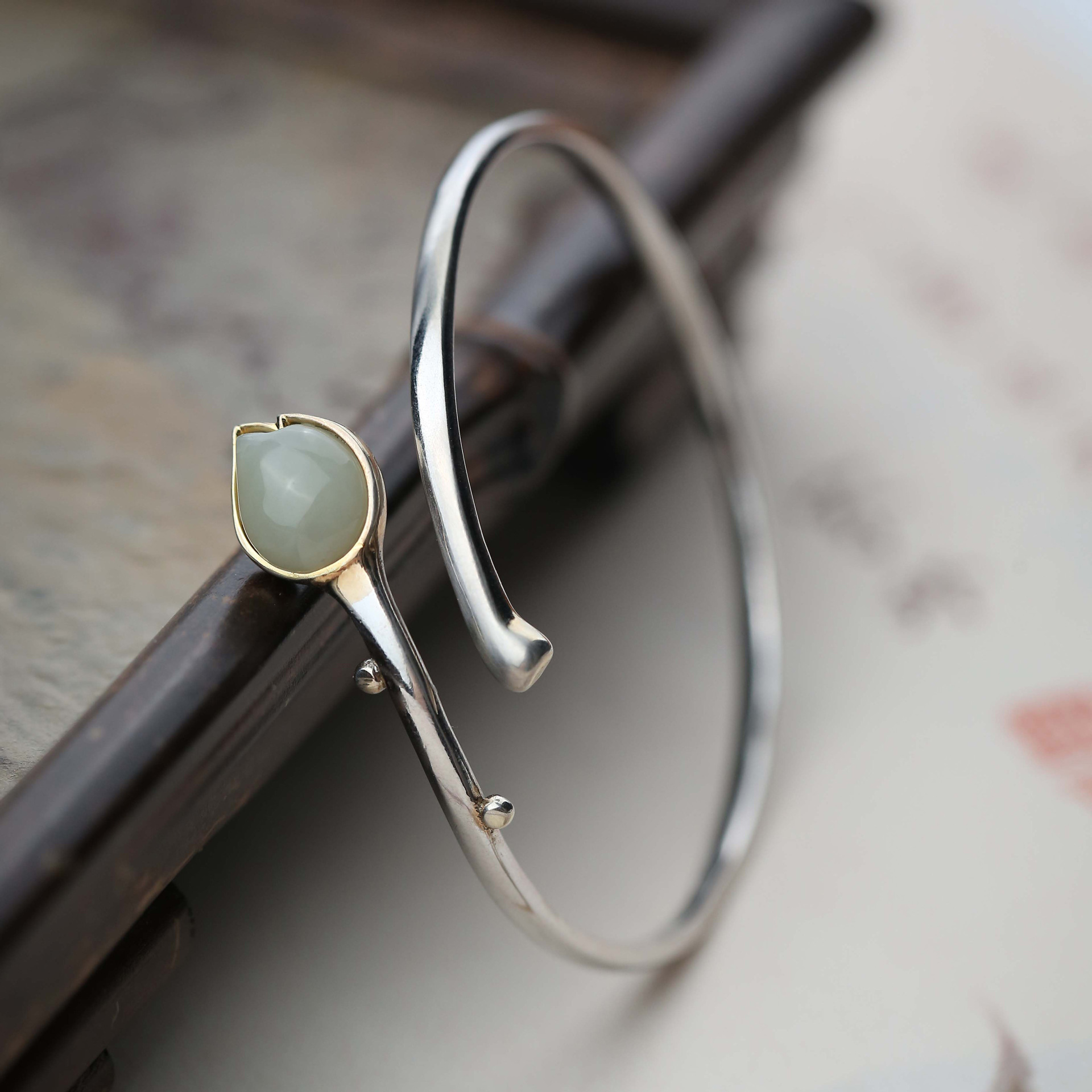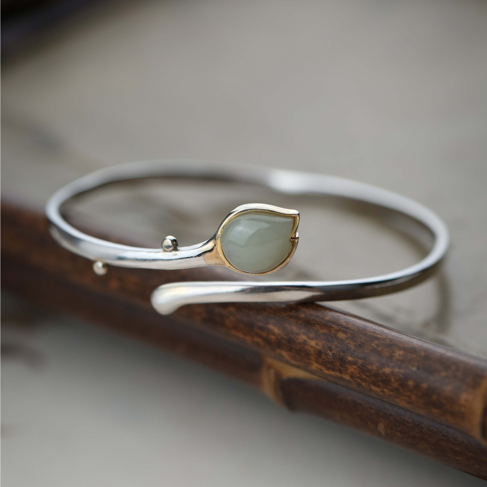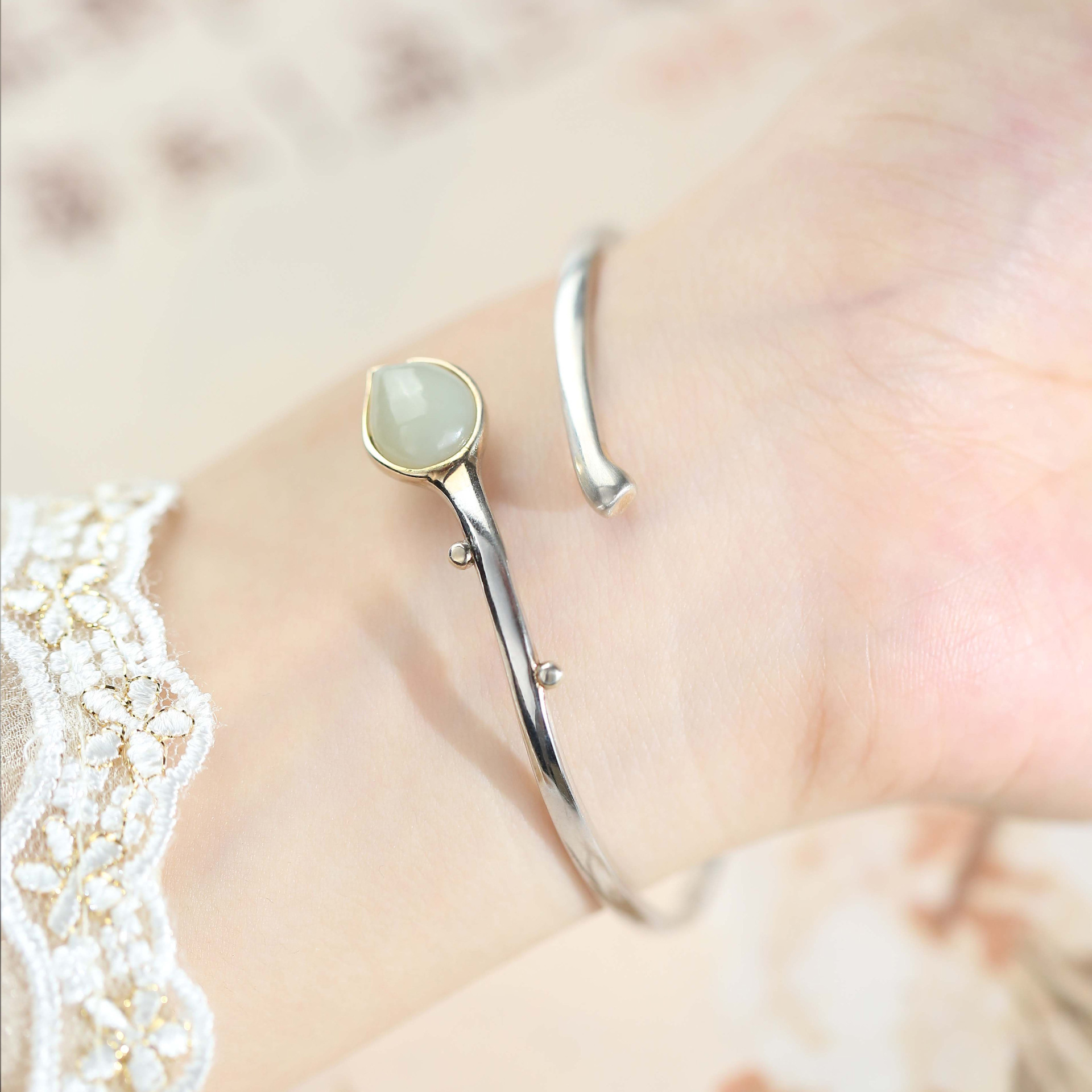 S925纯银镶嵌和田玉开口手镯精致复古新中式新款人气轻奢花朵