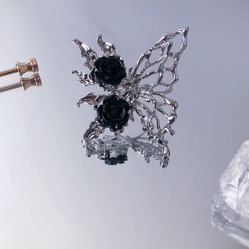 小众黑色玫瑰液态蝴蝶开口戒指ins设计感甜酷辣妹轻奢可调节指环