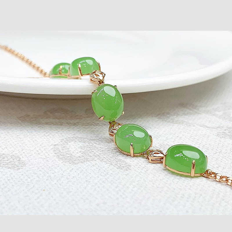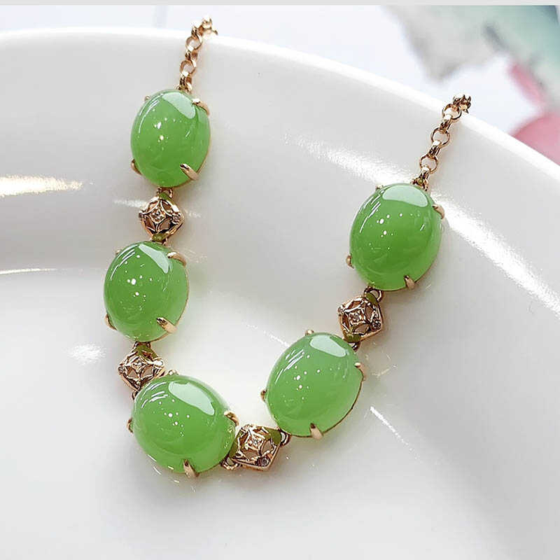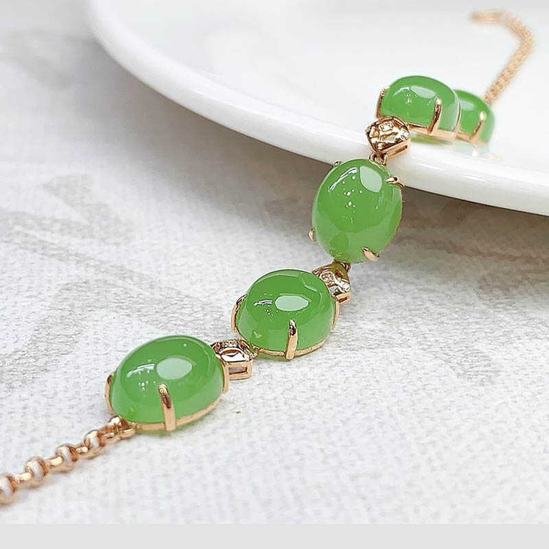 中秋天然新疆和田玉碧玉蛋面镶18k金手链女苹果绿a货玉石珠子手串