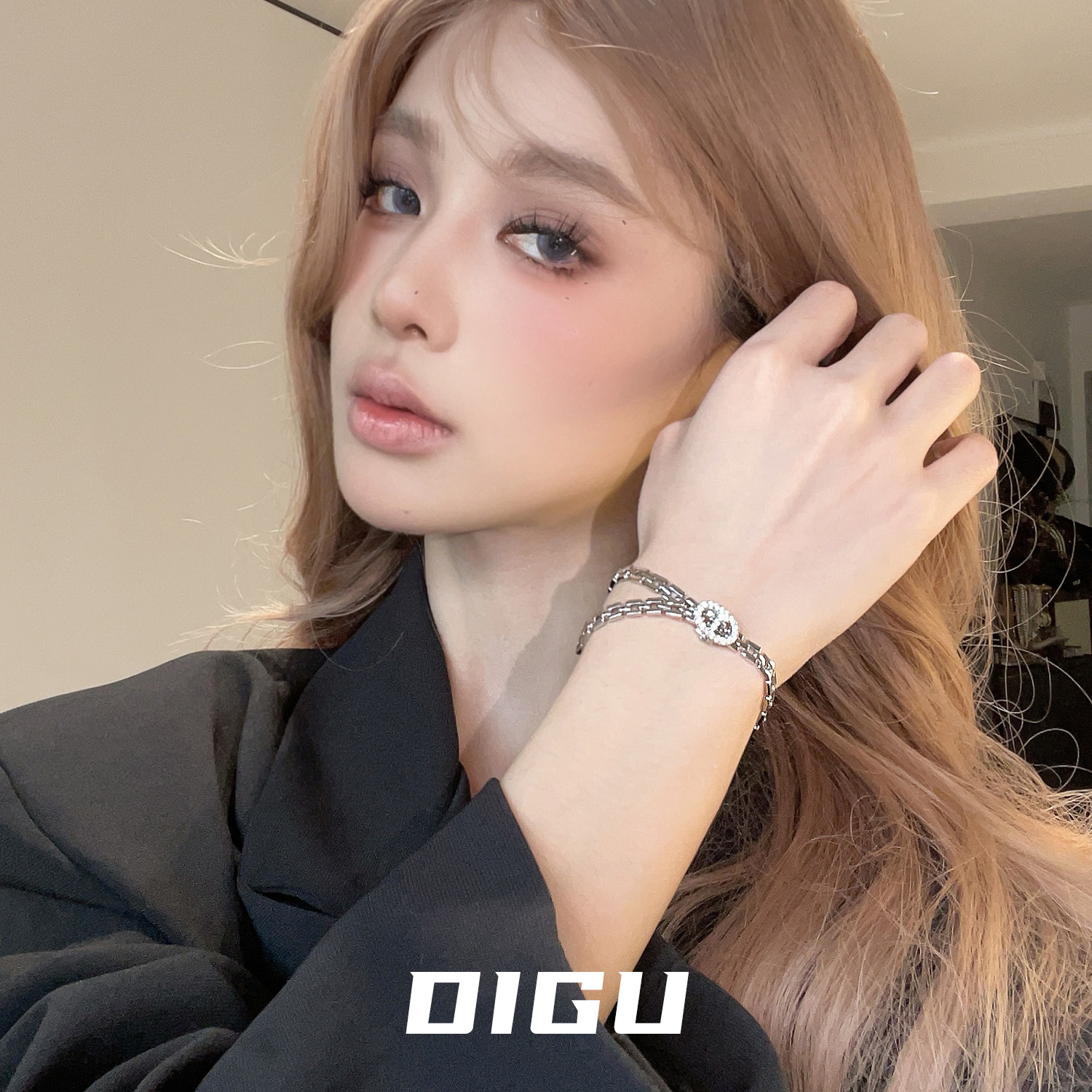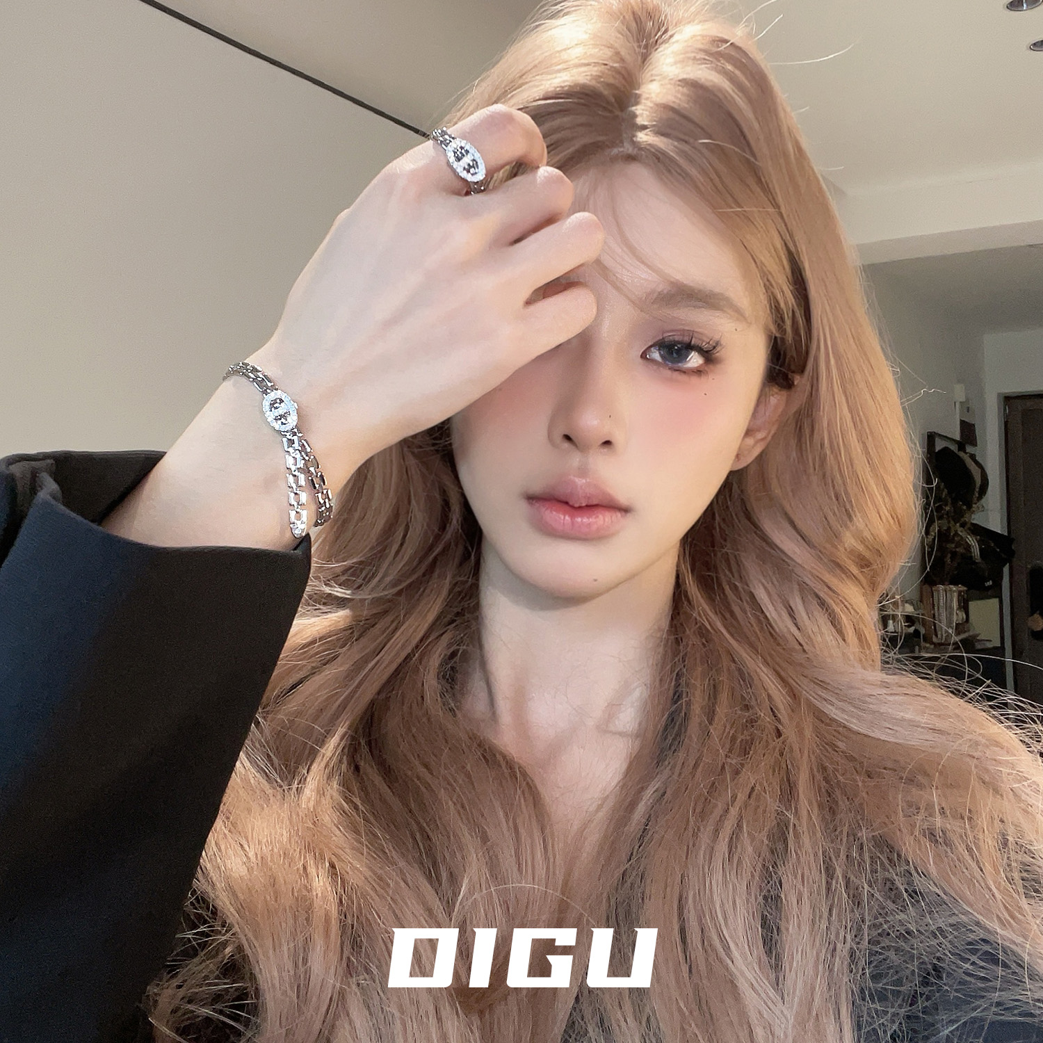 四肢纤长摆出蜘蛛姿势,手戴5个金首饰