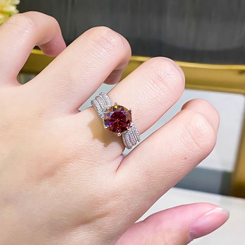 18K白金D色莫桑石群镶三排钻红宝石扭臂戒指纯银钻戒时尚奢华气质