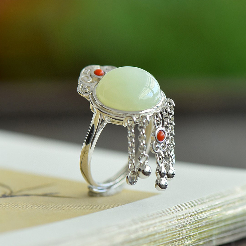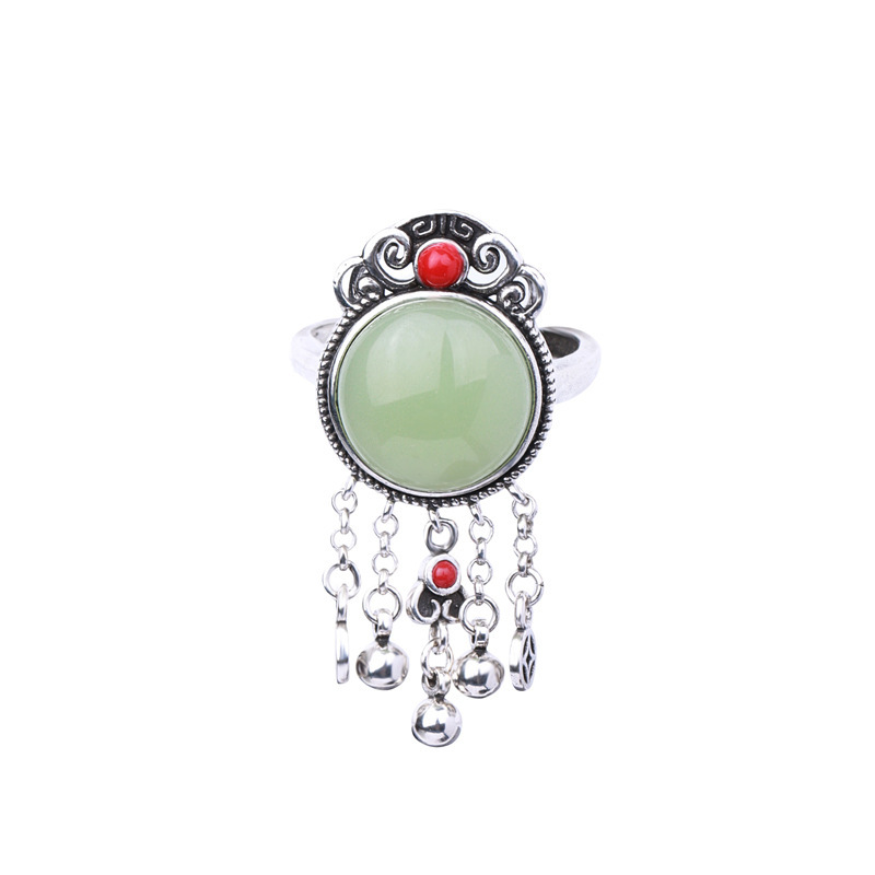 新品复古民族风蛋面流苏仿和田玉戒指做旧开口指环中式