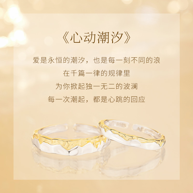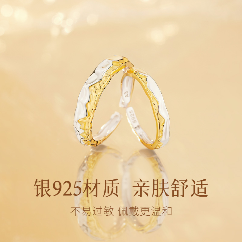 中国黄金珍尚银潮汐情侣对戒纯银戒指小众设计生日礼物送女友S925