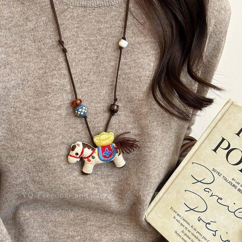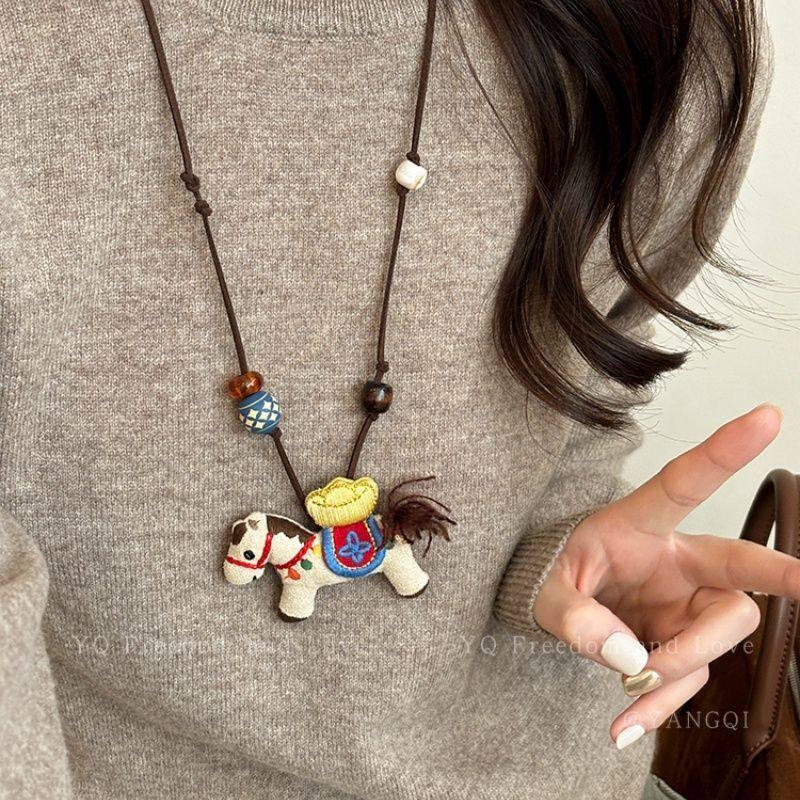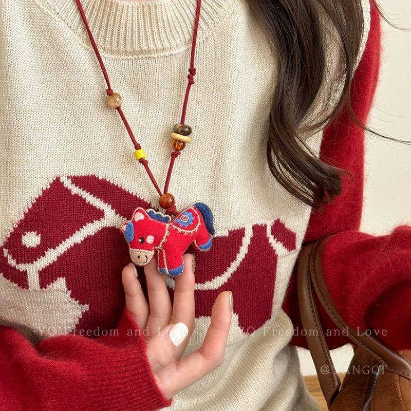 马年吉祥物可爱小马串珠吊坠项链女 编织绳珠子装饰 高级感毛衣链
