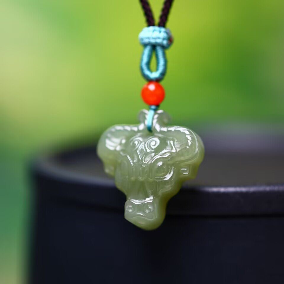 精致和田玉青海料牛头吊坠编织绳古风项坠男女款小众玉石挂件饰品